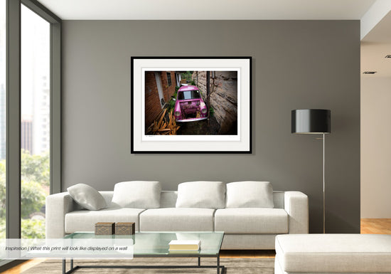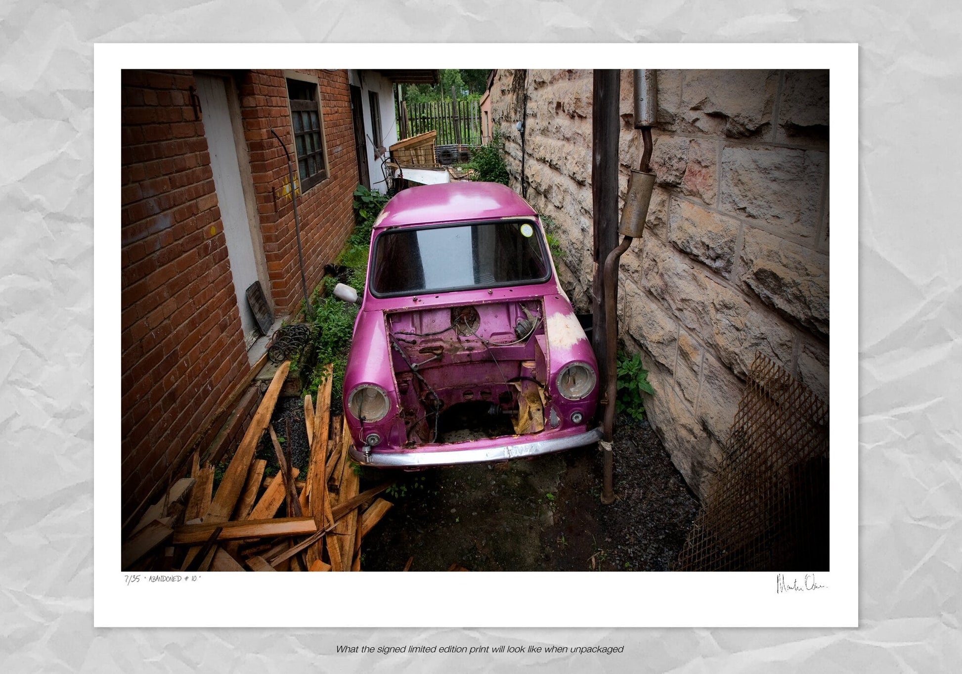 The bright pink colour of this classic Mini Minor is found abandoned between two buildings near Orobie Gorge in Kwa Zulu Natal.