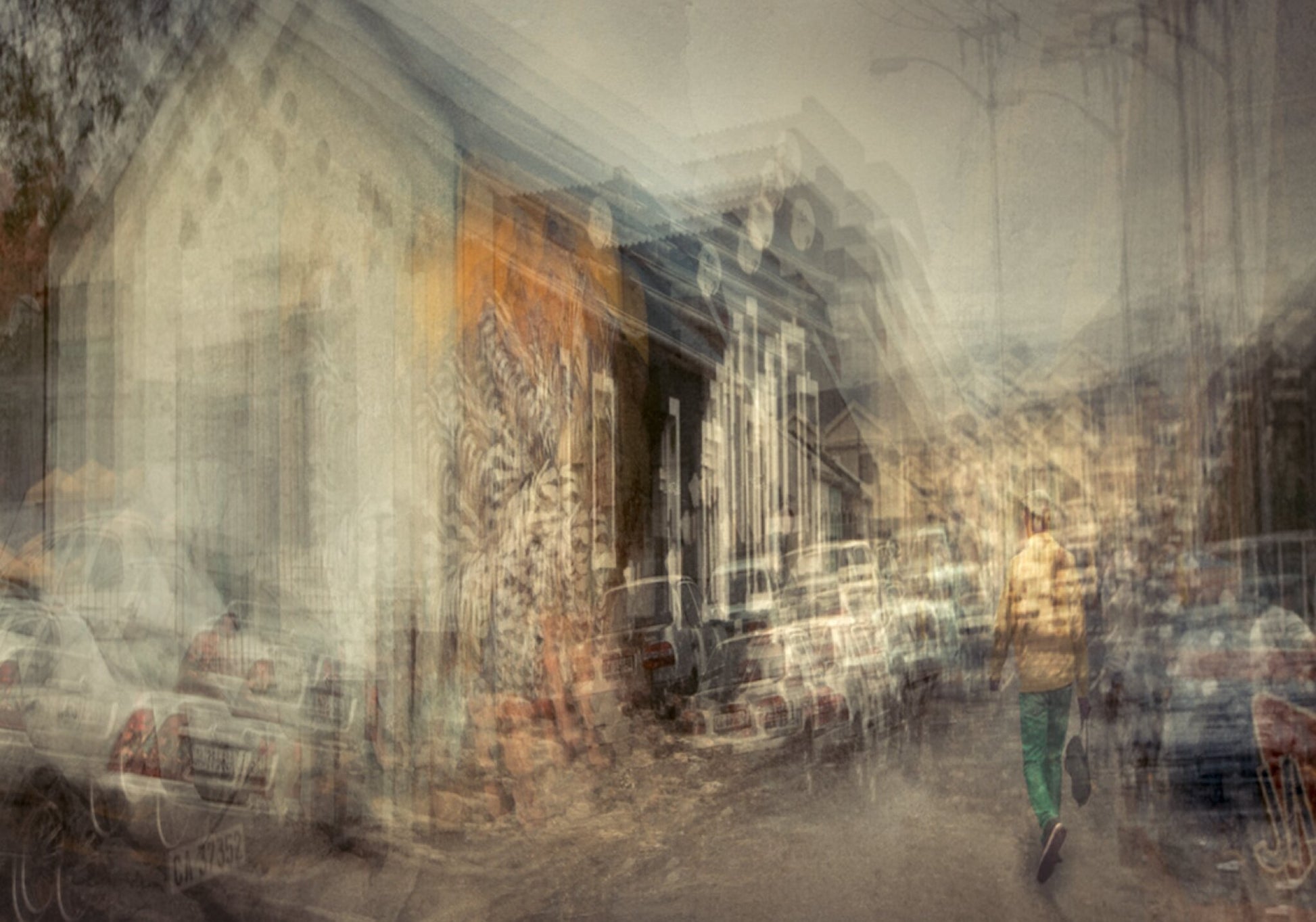 A lively abstract photograph of a pedestrian walking down a busy street in the Woodstock district of Cape Town.