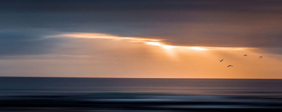 An incredible abstract impression was photographed over the Atlantic ocean as birds are seen flying through the last light of the day.