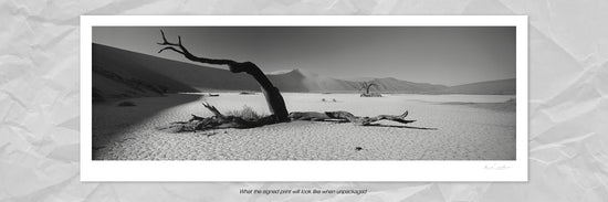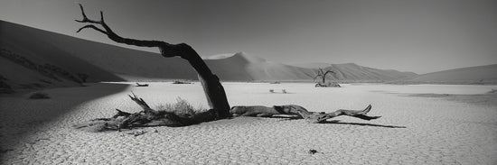 A stunning black and white photograph of dead trees standing in a dry pan of Namibia.