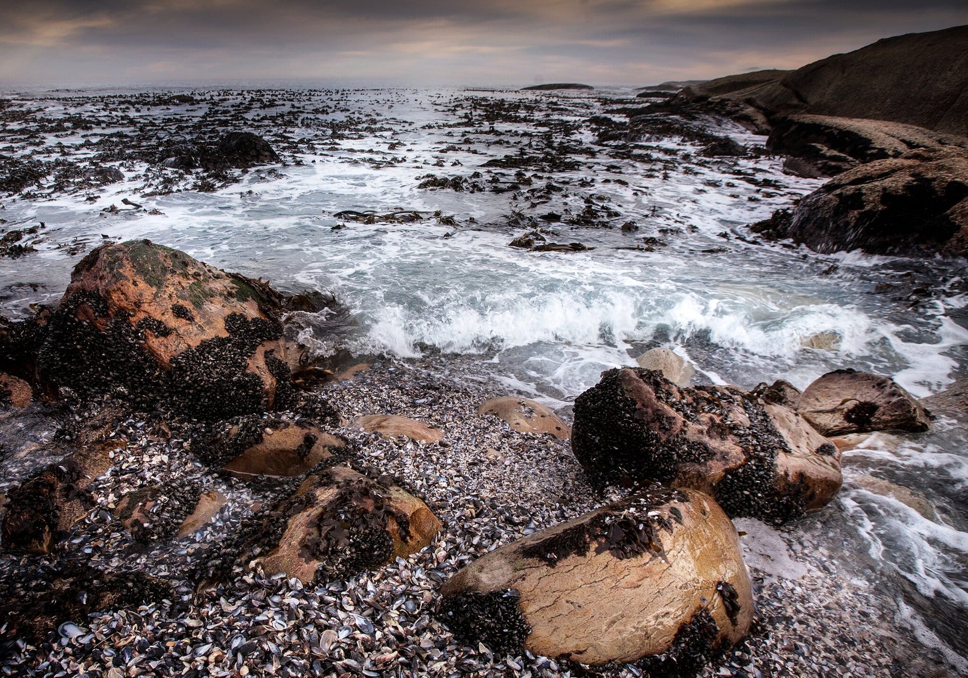 A breathtaking ocean view photographed on a shelly beach in mid-winter in the midst of a storm near Camps Bay in Cape Town.