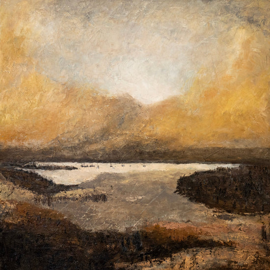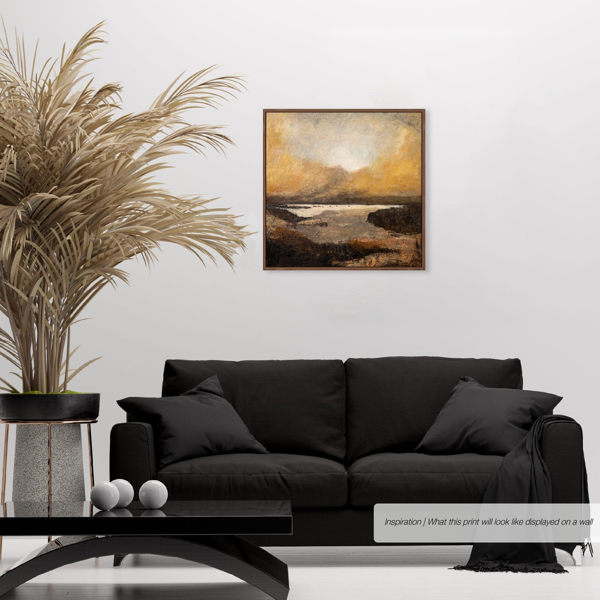 Beneath a warm, dramatic sky, the landscape unfolds in hues that echo the earth's embrace. A distant lake beckons, its reflection a mirror to the symphony of warm tones above. A tapestry of emotion—a moment suspended in the poetry of an abstract impressionist's vision.
