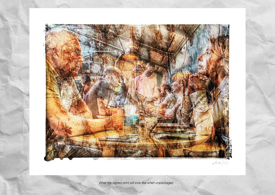This artwork of a restaurant scene on Valentine's Day was created using multiple exposures and texture overlays.
