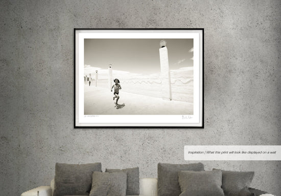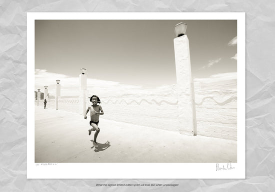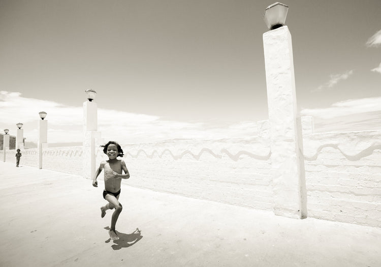 An uplifting black and white photograph of a happy young boy sprinting along the promenade near Macassar in Cape Town.