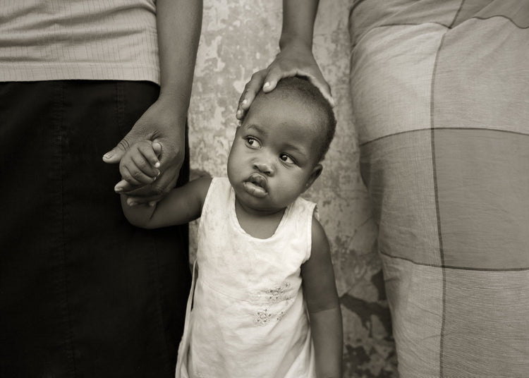 A captivating black and white portrait by Martin Osner of a young girl being encouraged to look in the camera by her mother.