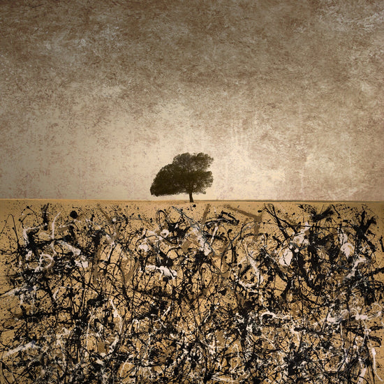An incredible mixed media artwork of a solitary tree portrayed in an abstract world, inspired by the brilliant artist Jackson Pollock.