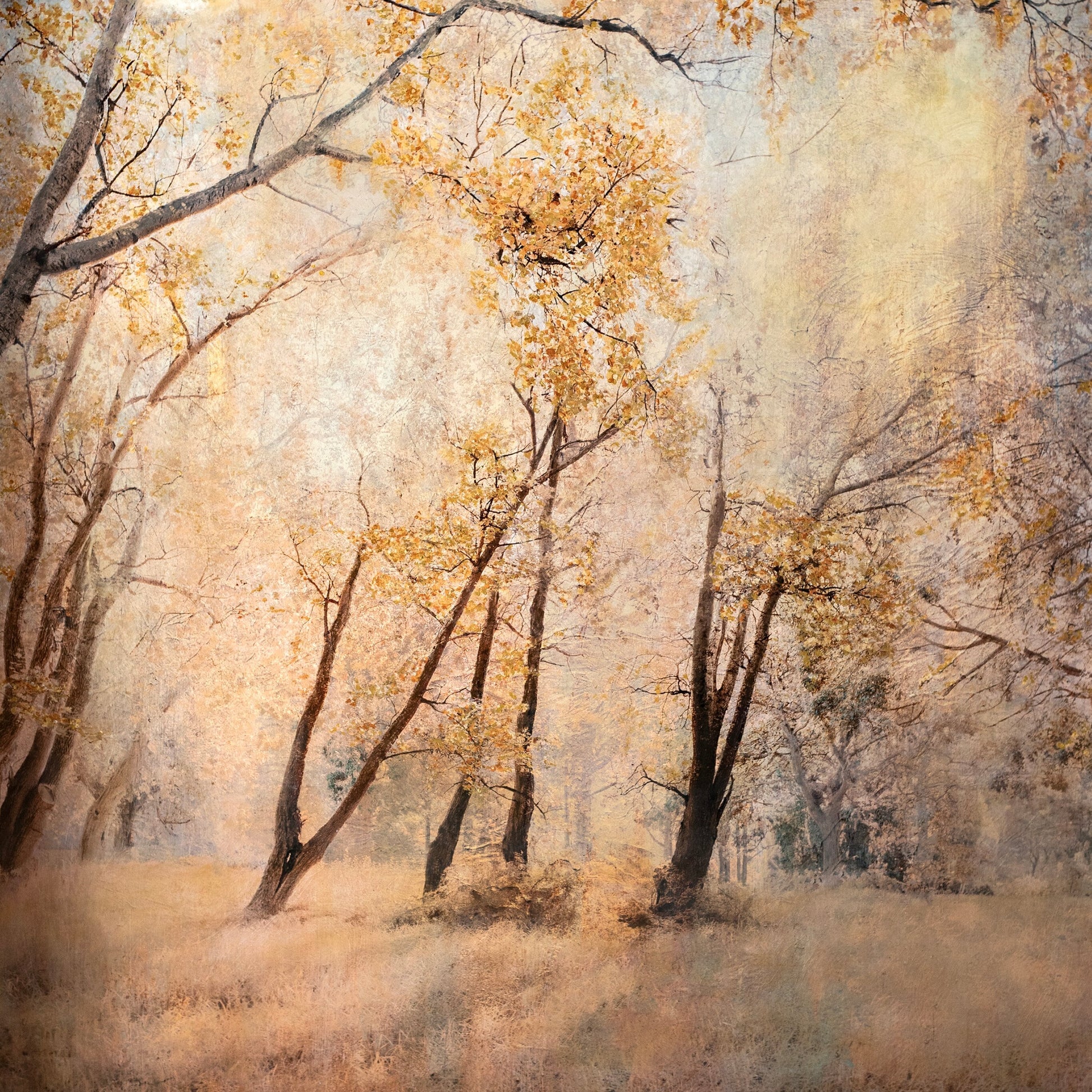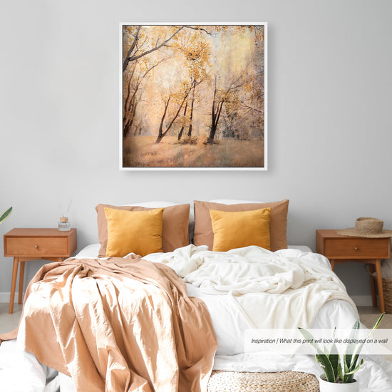 A regal forest setting, bathed in golden hues, emanates a storybook enchantment. This limited edition of five artworks is each individually painted and adorned with delicate gold leaf embellishments, creating a captivating and magical ambiance. The result transports the viewer to a fairy-tale world, bathed in warmth and allure..