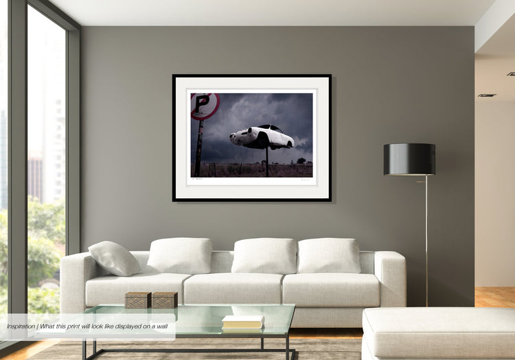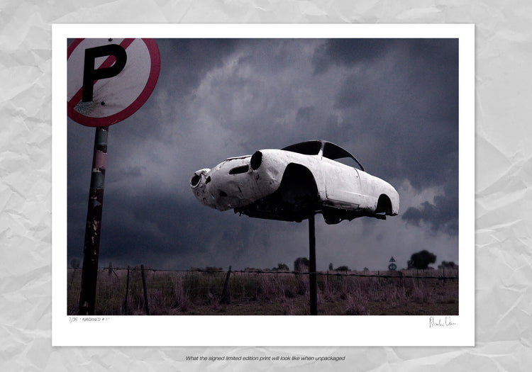 An impressive limited edition photographic print of an old Austin Healy perched on top of a pole behind a no parking sign. This limited edition print is sold with a certificate of authenticity.