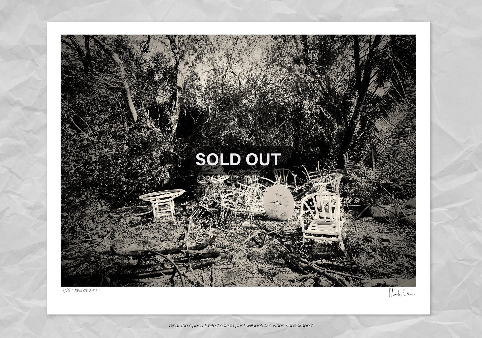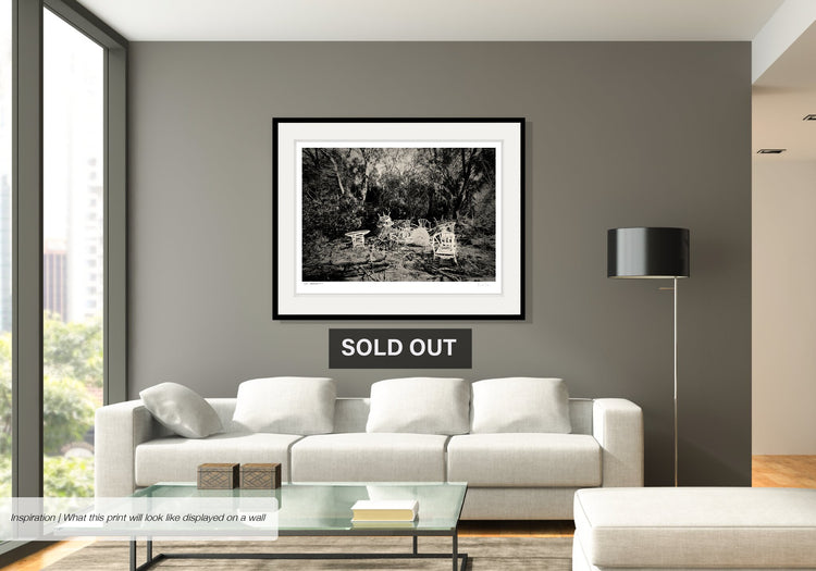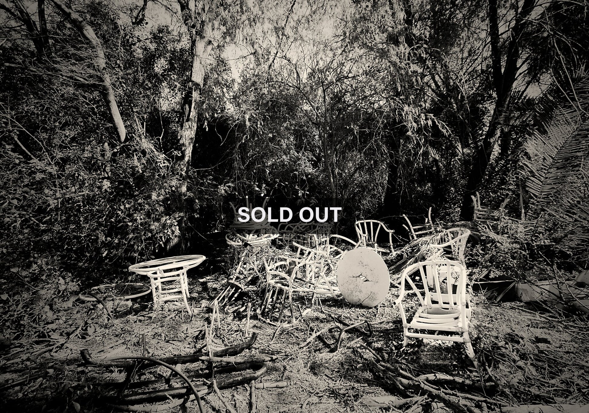 A popular black and white limited edition photographic print taken of abandoned outdoor furniture. This limited edition print has sold out and is no longer available for purchase.