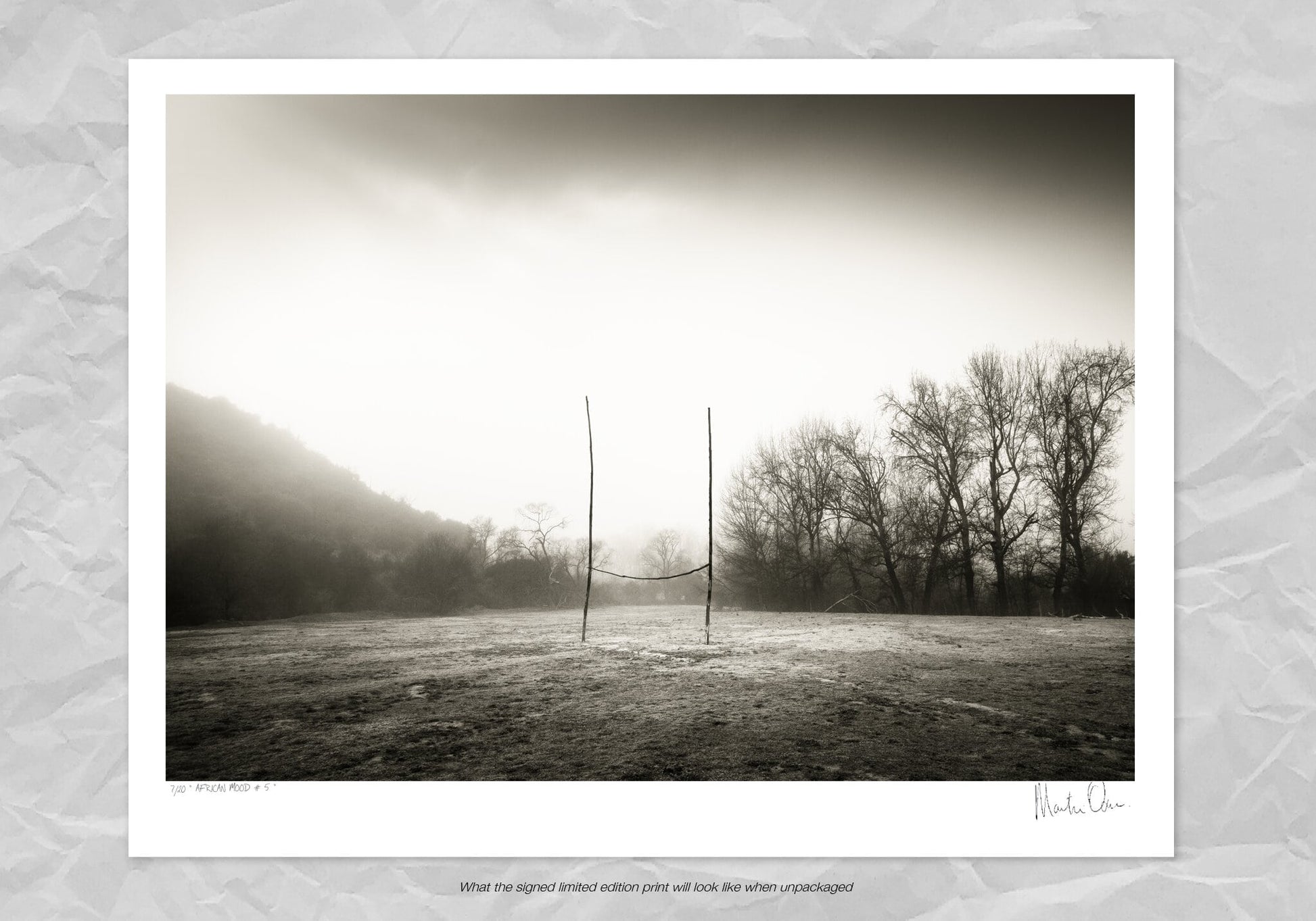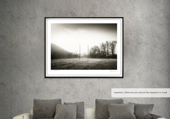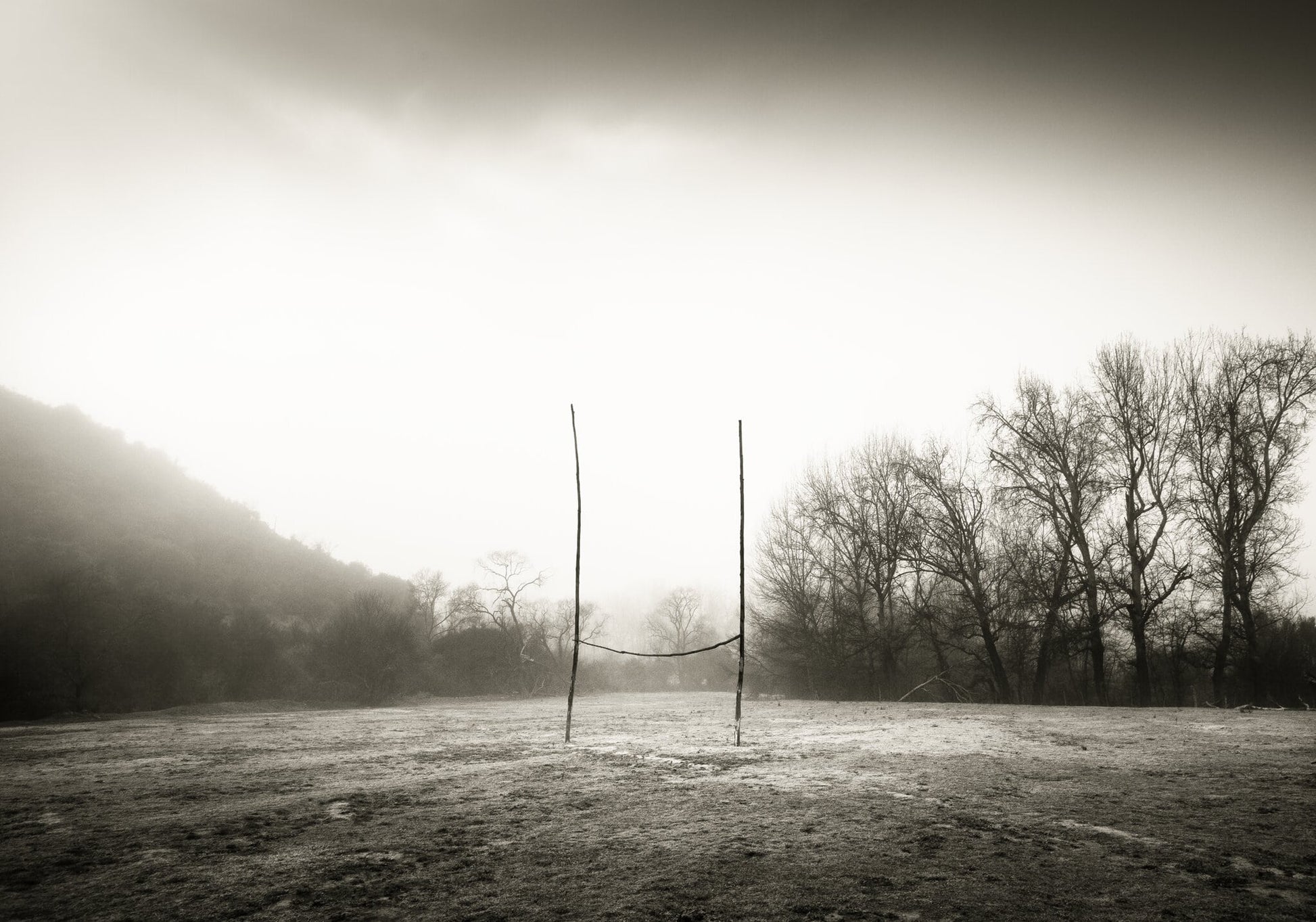This black and white photograph was taken at cross rivers in the Western Cape, on a misty winters morning near a farm called the "Boplass". Rugby is like a religion in South Africa and makeshift poles on an open piece of land is a common sight in the rural areas throughout the country.