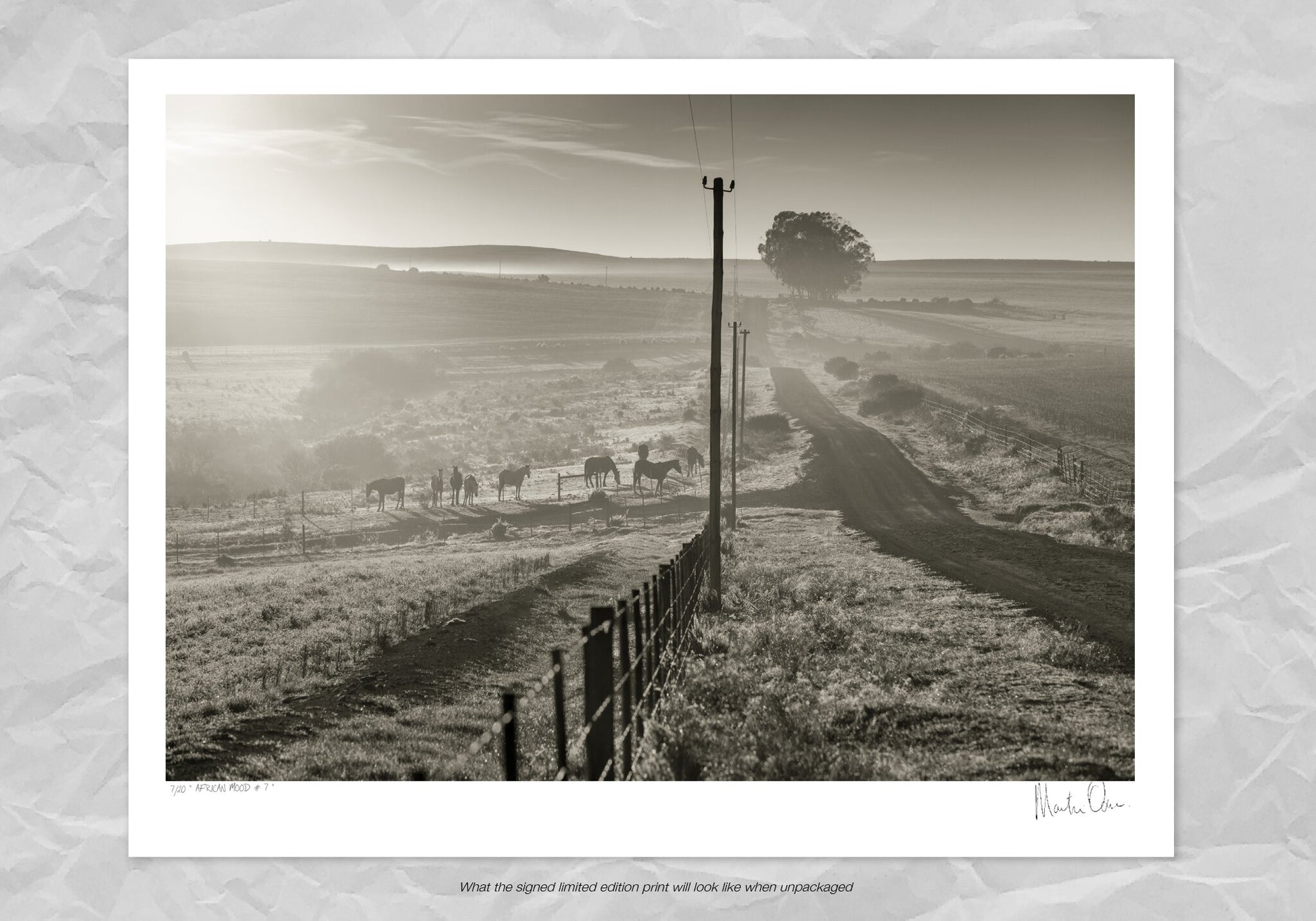 Unless otherwise stated, our prices are for unframed prints. However, we do offer a professional framing service through our in-house workshop. Simply place your print order, and then contact us to arrange framing. You can view our framing styles at osnerframing.co.za. We specialise in modern, simple frames using black, white, and natural woods (light or dark) in several modern profiles.