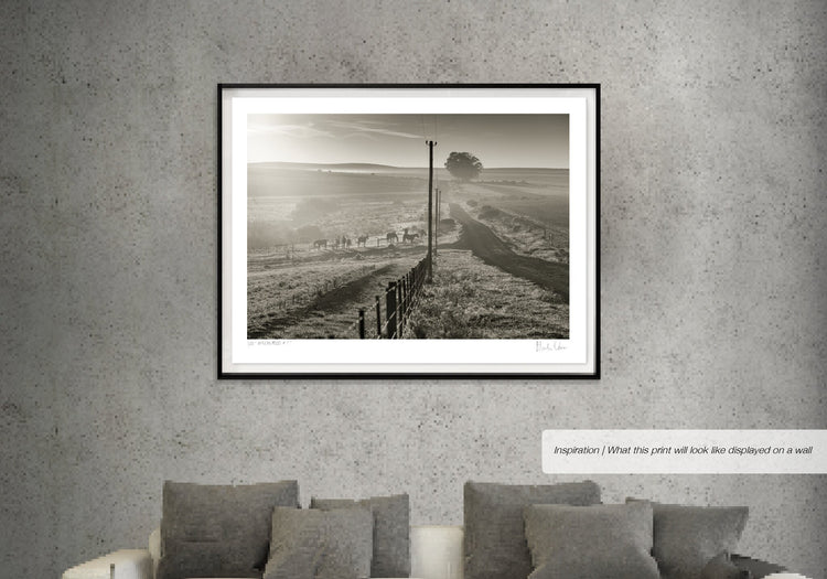 A misty morning on a dirt road out in the countryside. This black and white photograph with horses in the field captures the essence of an African rural landscape.