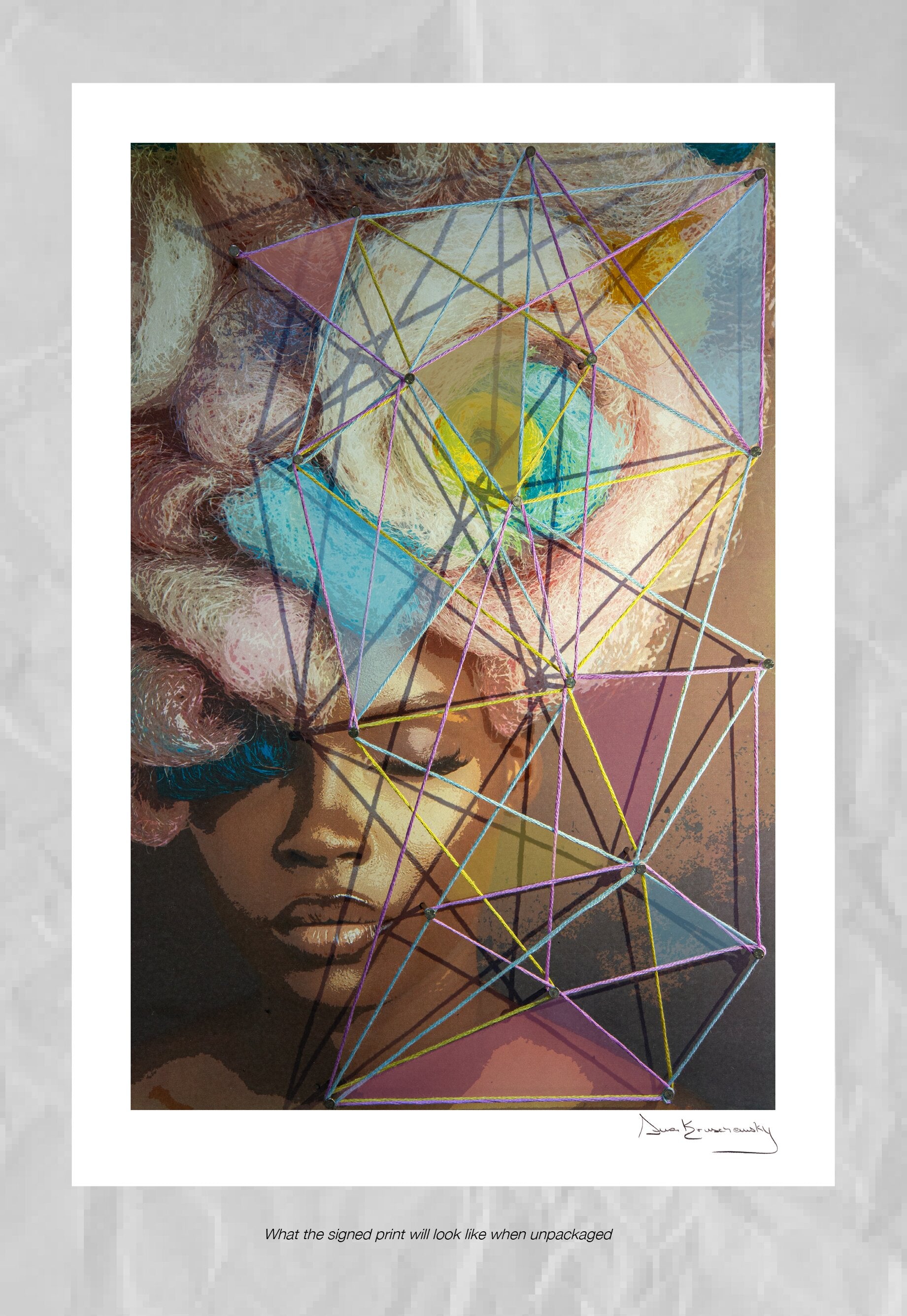 Created using a pop-art overlay and finished off using nails and thread as a graphic, elevated textured layer.