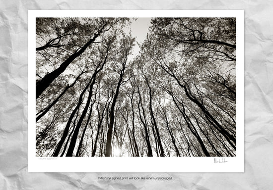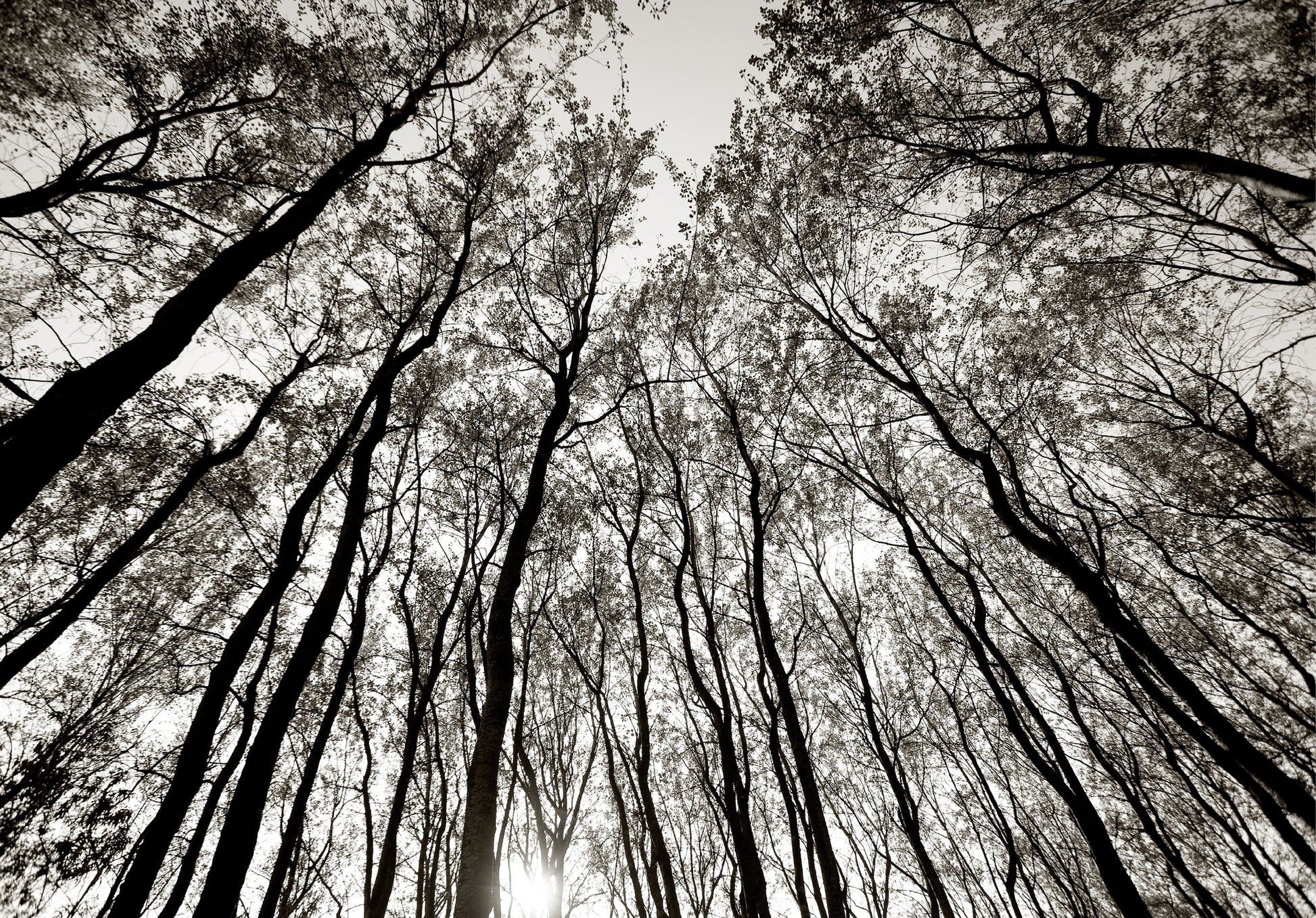 An impressive graphic black and white photograph taken of a canopy of trees in the Drakensberg of Kwa Zulu Natal.