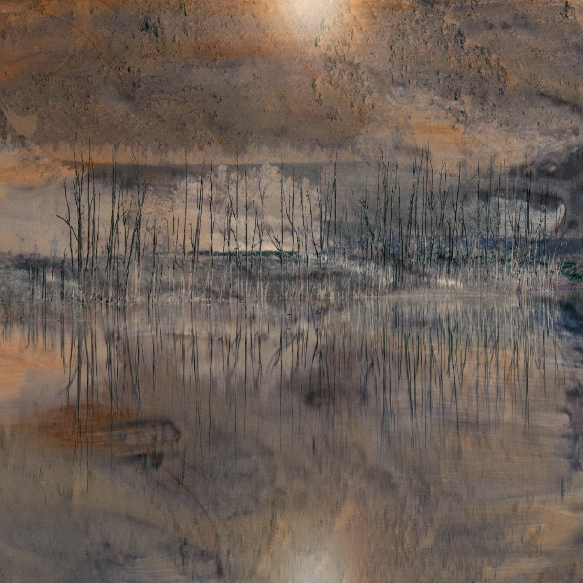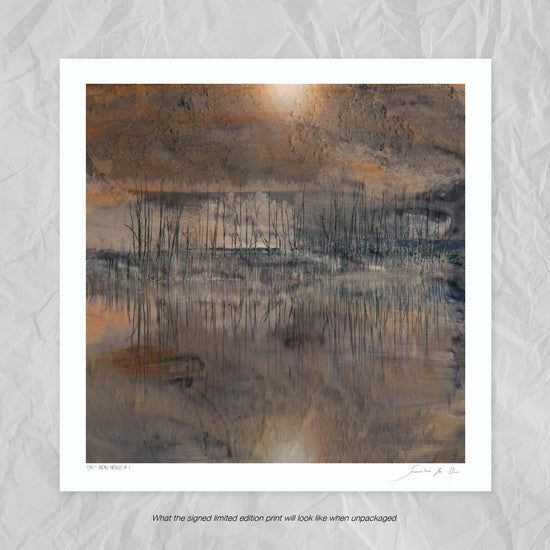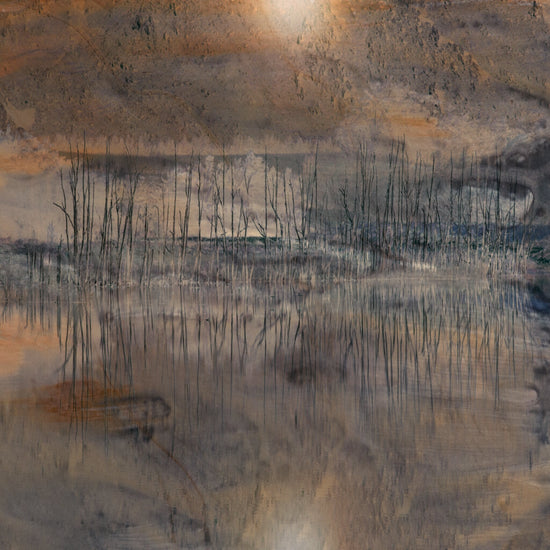 A mixed media landscape in a midnight palette, blending photography, paint, and texture overlays. Stark, silhouetted trees rise from reflective waters, creating a moody and atmospheric composition. This incredible limited-edition print exudes sophistication and ambience, capturing the quiet mystery of nature.
