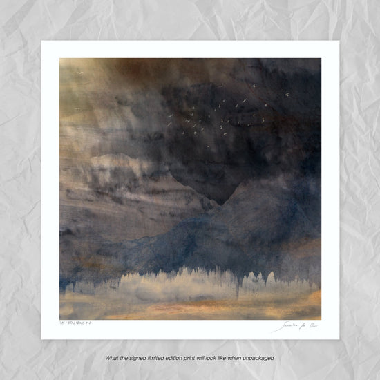 A mixed media landscape in a midnight palette, blending photography, paint, and texture overlays. Deep shadows and storm-laden skies create a moody, cinematic scene where distant birds rise above misty treetops. This incredible limited-edition print exudes sophistication and ambience, capturing the mystery and power of nature.