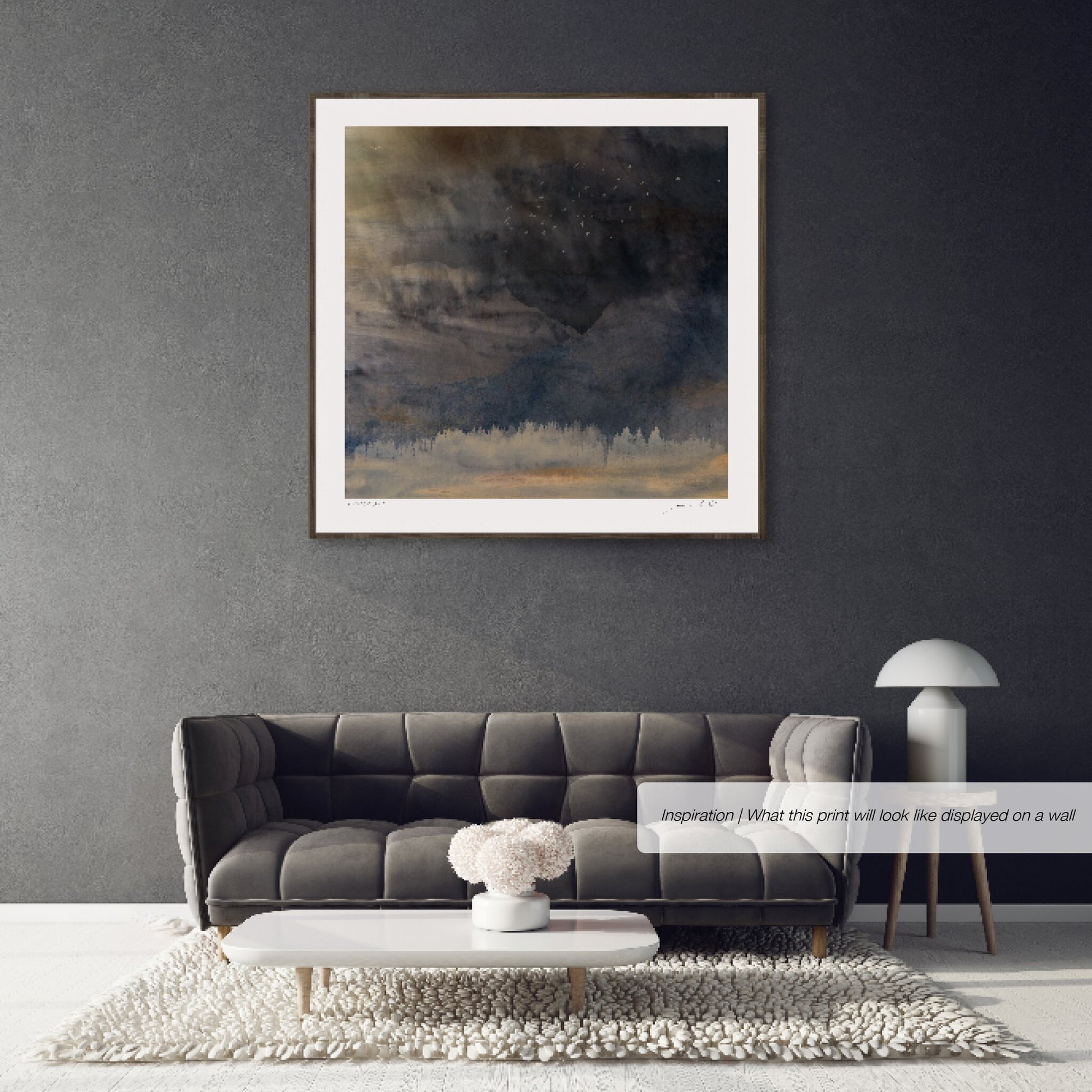 A mixed media landscape in a midnight mood was created using paint and texture overlays. This incredible limited-edition print exudes sophistication in a calm, surreal setting.
