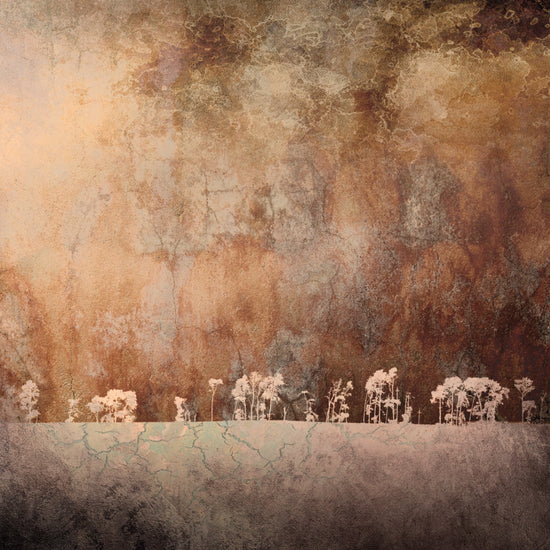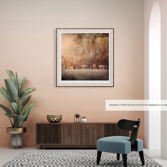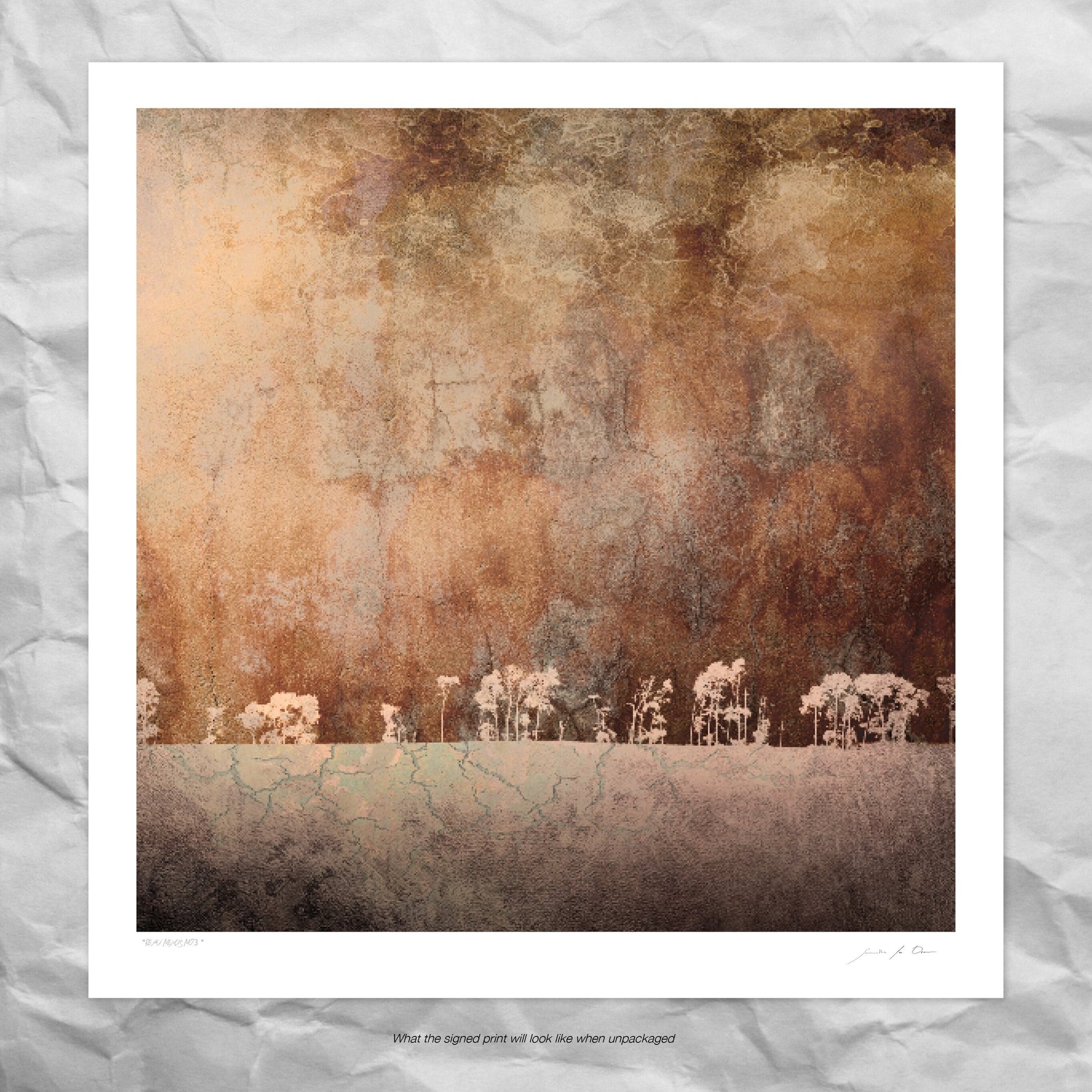 A mixed media landscape with an earthy tonal palette, blending photography, paint, and texture overlays. Delicate, silhouetted trees rise against a richly textured backdrop, evoking harmony and contrast. This incredible limited-edition print exudes sophistication and ambience, capturing nature’s quiet resilience.