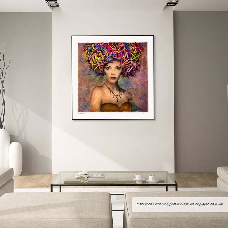 Candy Girl No.1 is a striking mixed-media portrait that playfully balances elegance with attitude. Combining painted softness with photographic realism, this artwork explores the juxtaposition between fine art and visual texture. Her candy-coloured hair is made from hyper-realistic rubber bands, photographed and layered in dimensional relief — creating a bold contrast with her serene, hand-painted features.