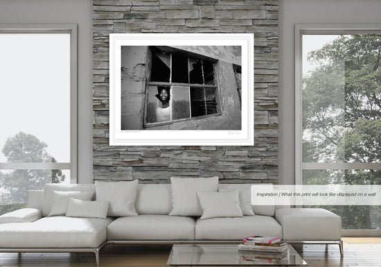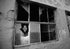 This brilliant uplifting black and white documentary photograph was taken of a young girl looking through a broken window.