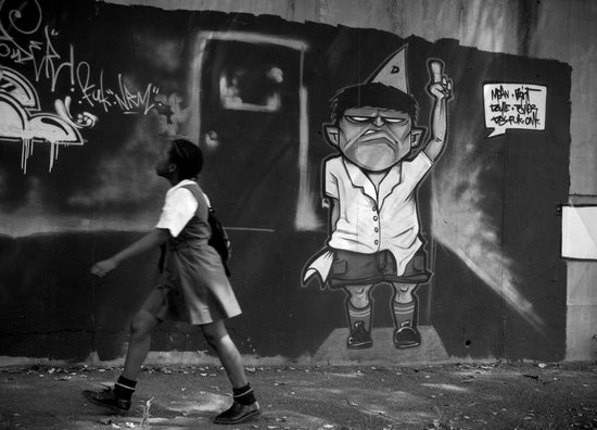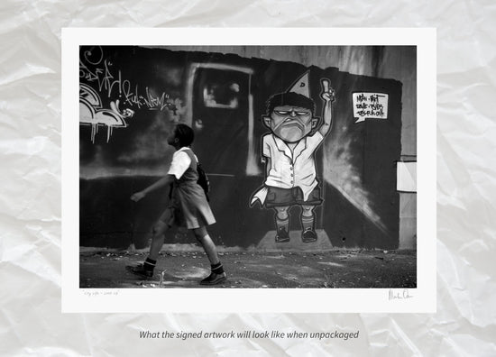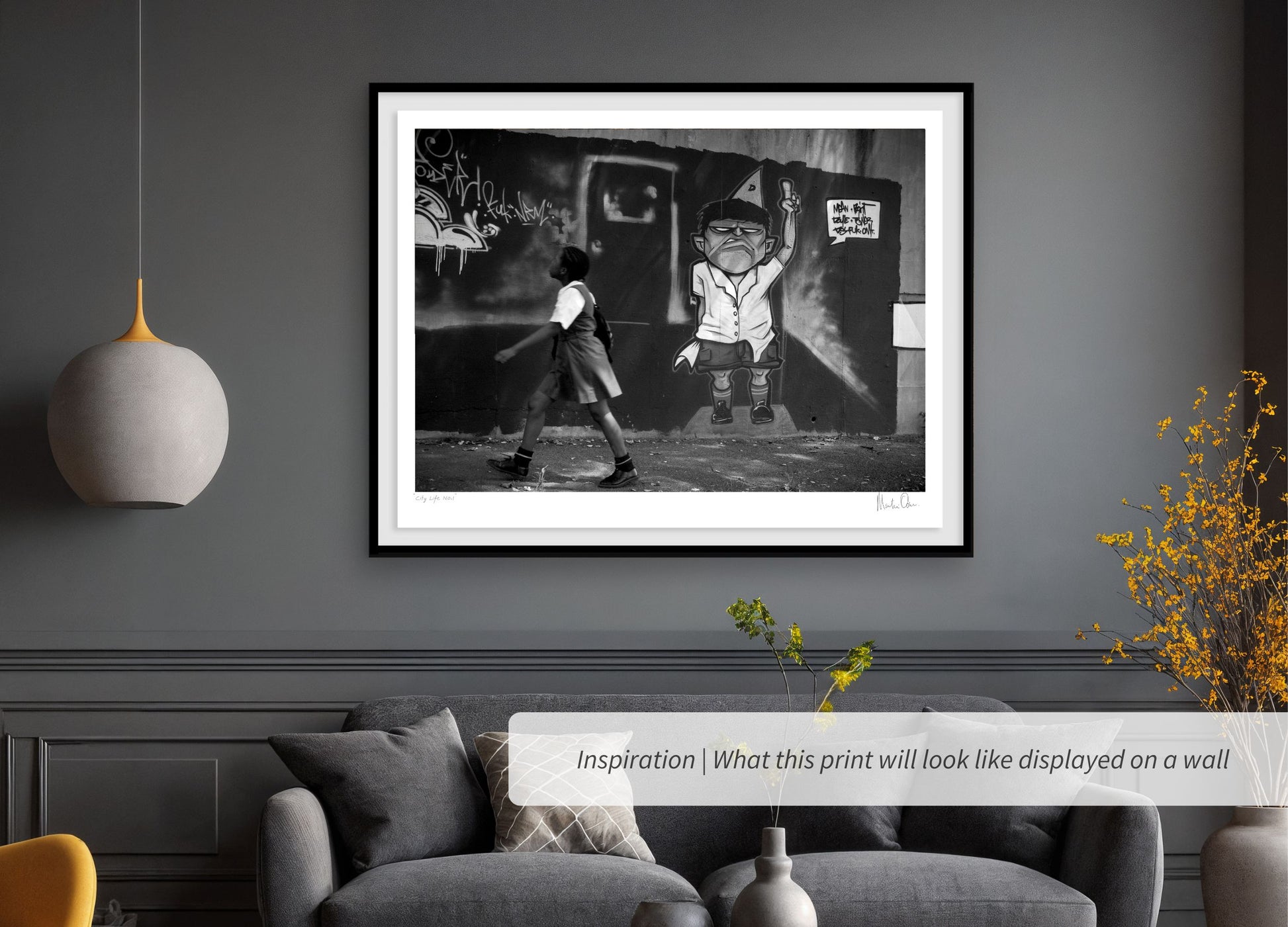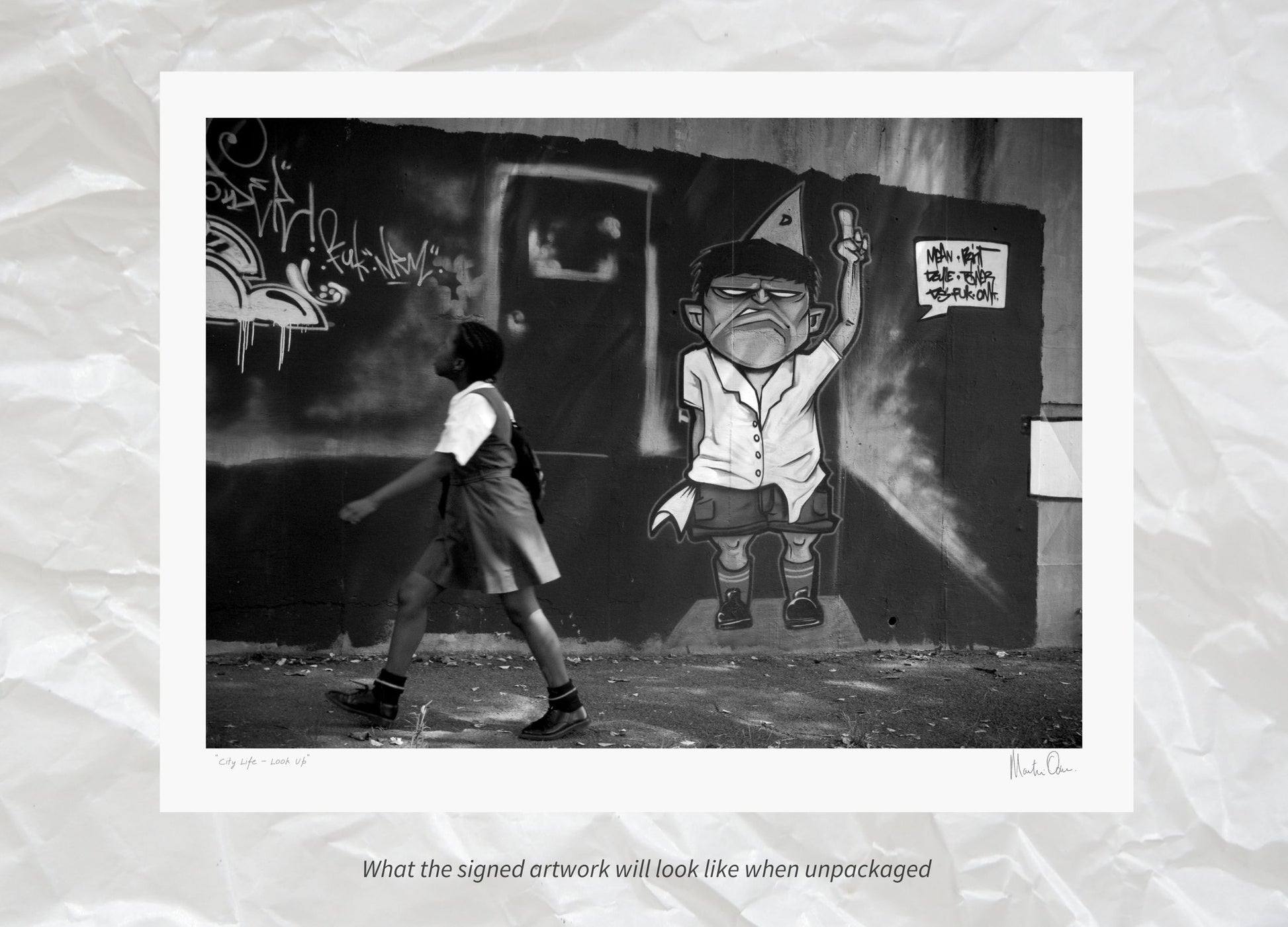Photographed in Johannesburg in 2004, Look Up captures a playful and uplifting encounter between life and art. A schoolgirl strides past a graffiti mural of a schoolboy cartoon figure, whose raised hand seems to command her attention — a silent message to "look up" to keep her chin up, study hard, and move forward with confidence. Her light step and bright energy complete the unspoken exchange as she accepts his encouragement.