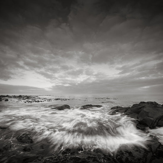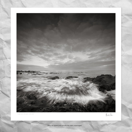 An alluring black and white seascape photograph taken at Jacobs Bay up the West Coast of Cape Town features waves breaking over rocks on the shoreline. This print forms part of a complete "Classic B&W" series photographed in tribute by the artist to his mentor, the great Ansel Adams.