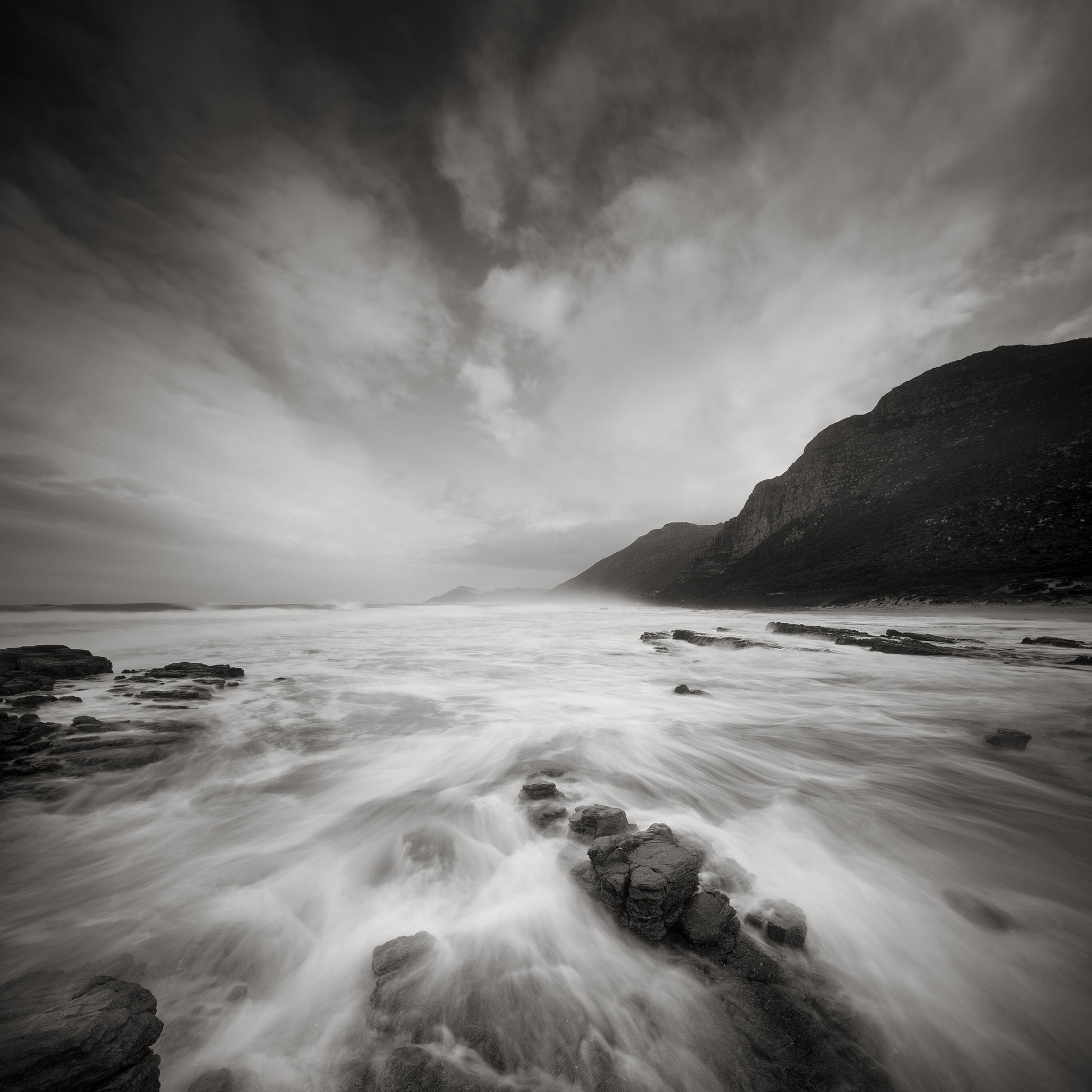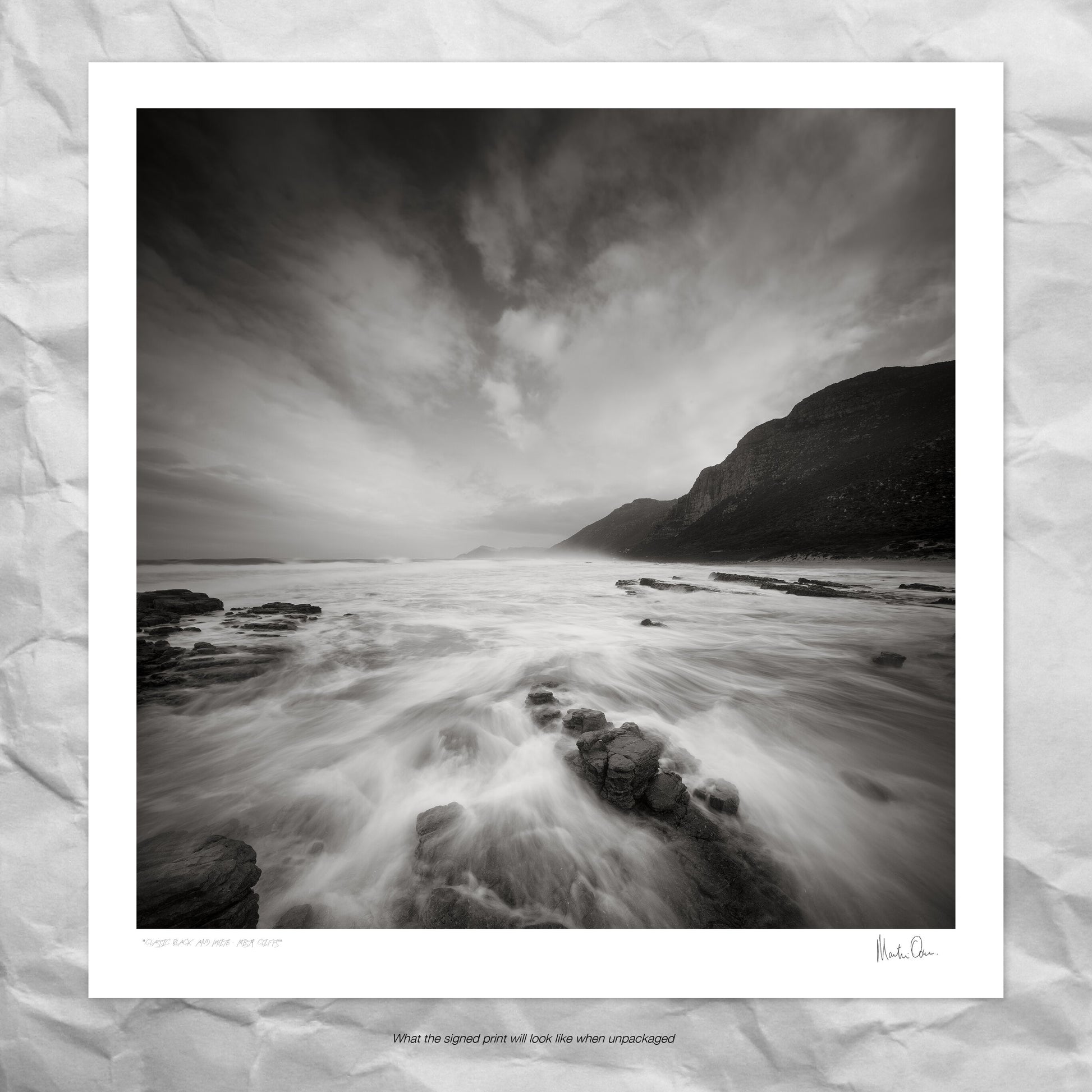 An alluring black and white seascape print photographed at Misty Cliffs, Cape Town. This print forms part of a complete "Classic B&W" series photographed in tribute by the artist to his mentor, the great Ansel Adams.