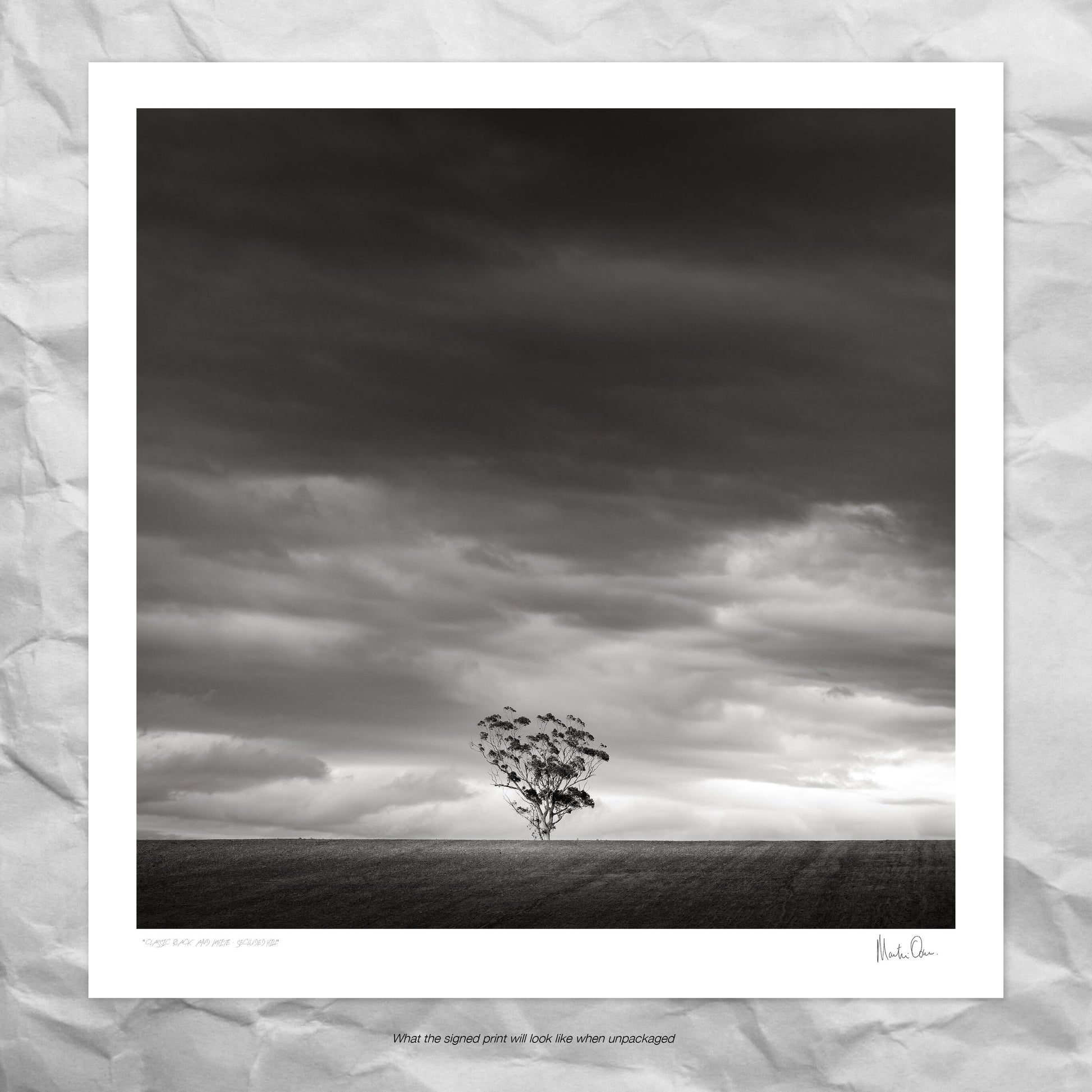A simplistic black and white photograph of a single tree on a hill. This print forms part of a complete "Classic B&W" series photographed in tribute by the artist to his mentor, the great Ansel Adams.