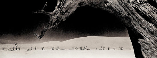 A moody black and white litho print of a dry tree photographed in Deadvlei in the Namibian desert by Antti Viitala.
