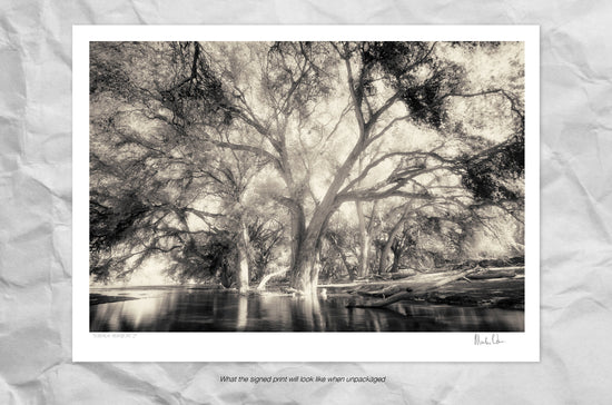 Photographed along the Kuiseb Canyon in Namibia using infra-red. This black and white photograph of trees along the river bank is only witnessed once every two decades when in flood.