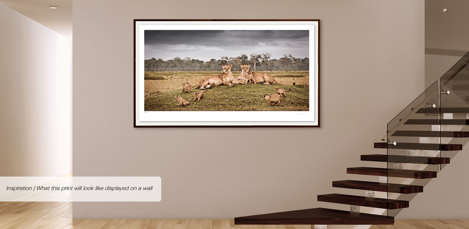 This incredible photograph of two lionesses with five playful cubs taken in Kenya is a classic in the Pride of Africa print collection.