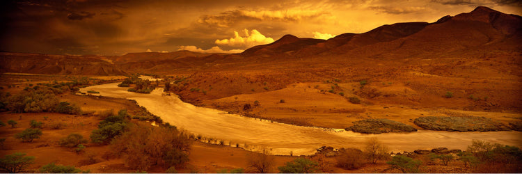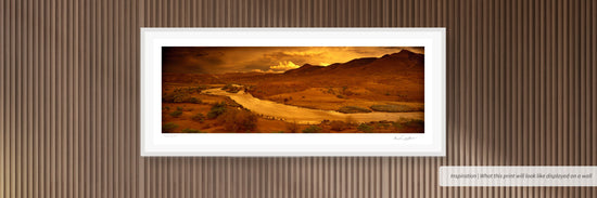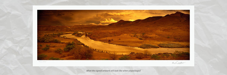 In A Glimpse of Glory, Koos van der Lende captures one of his photographic career's most powerful and spiritually moving moments. Created during a remote expedition into Southern Africa, this panoramic artwork reflects a fleeting moment in nature and a profound emotional and spiritual experience.