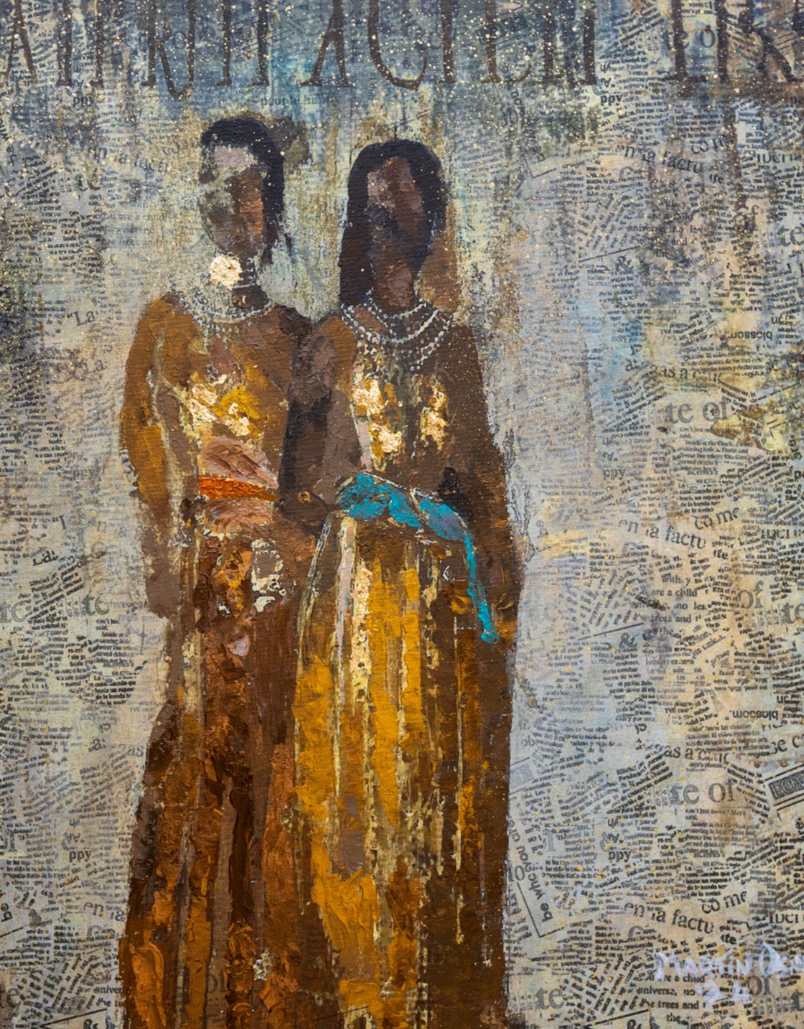 This piece from the African Queen series portrays two women adorned in vibrant attire, exuding grace and confidence. The abstract impressionistic style blends bold patterns, typography and rich colours, evoking the energy of a modern African celebration. Their poised figures reflect tradition intertwined with contemporary elegance. The artwork celebrates the beauty and spirit of African identity in a dynamic, festive setting.
