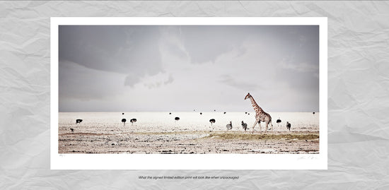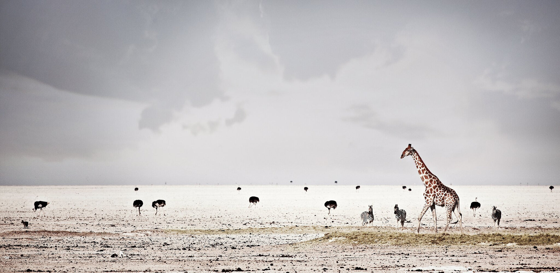 Giraffe, zebra and ostrich inhabit the open plains of Etosha in Namibia. Harmony between the animals, the land and the weather as the rain clouds build from the West.