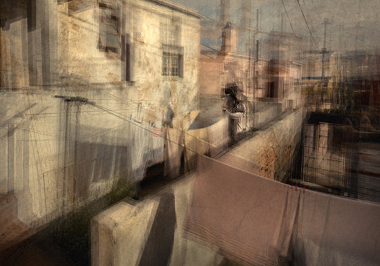A powerful abstract photograph of a woman in District Six, Cape Town hanging up her washing.