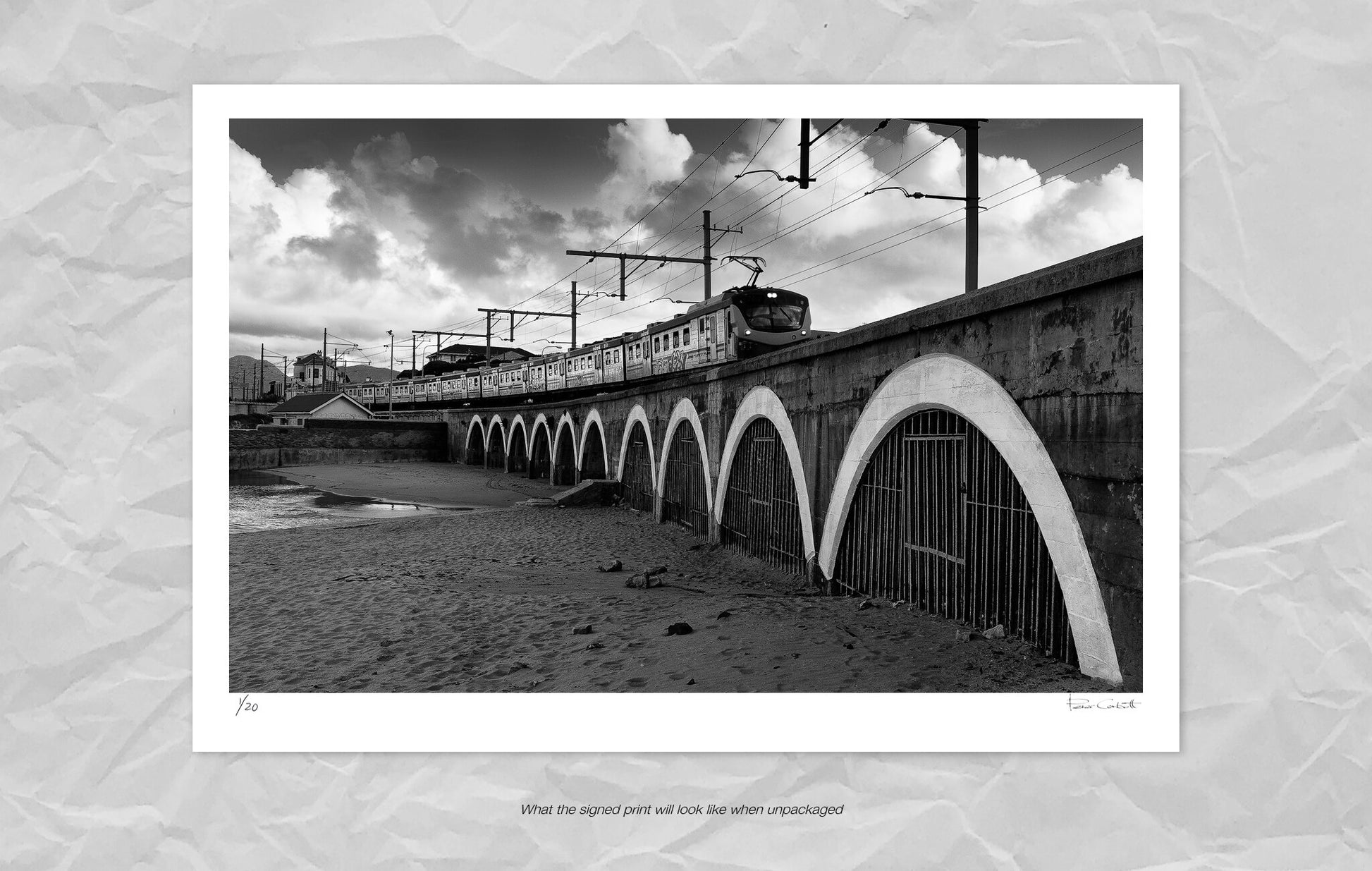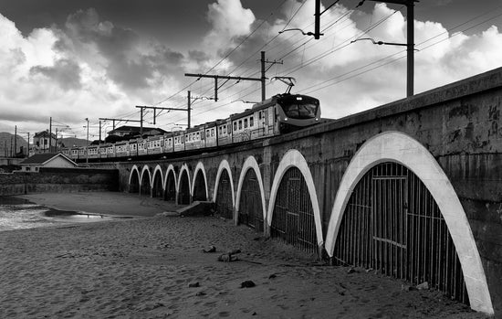 A classic black and white photograph of a train as it travels over the bridge into the eclectic and timeless town of Kalk Bay in Cape Town.