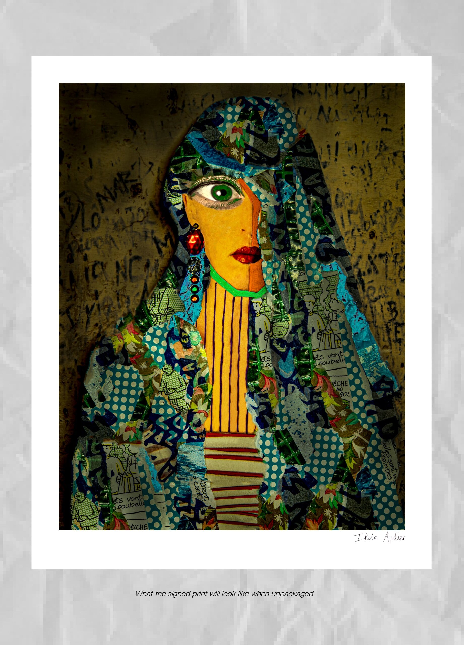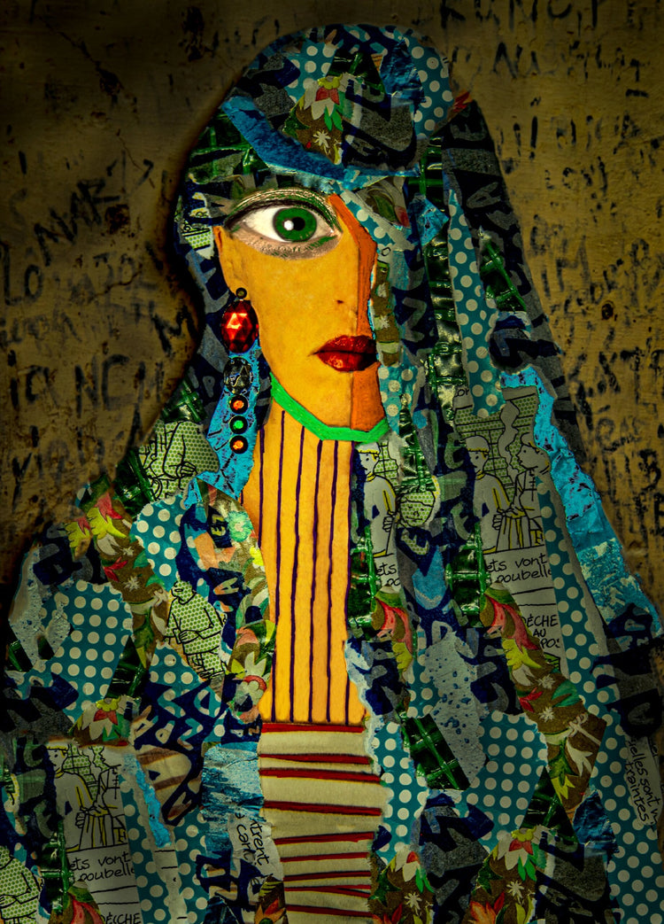 A surrealist self-portrait collage created using discarded pieces of paper and elements that have been hand-drawn. This work is a play between colour, pattern and long lines.