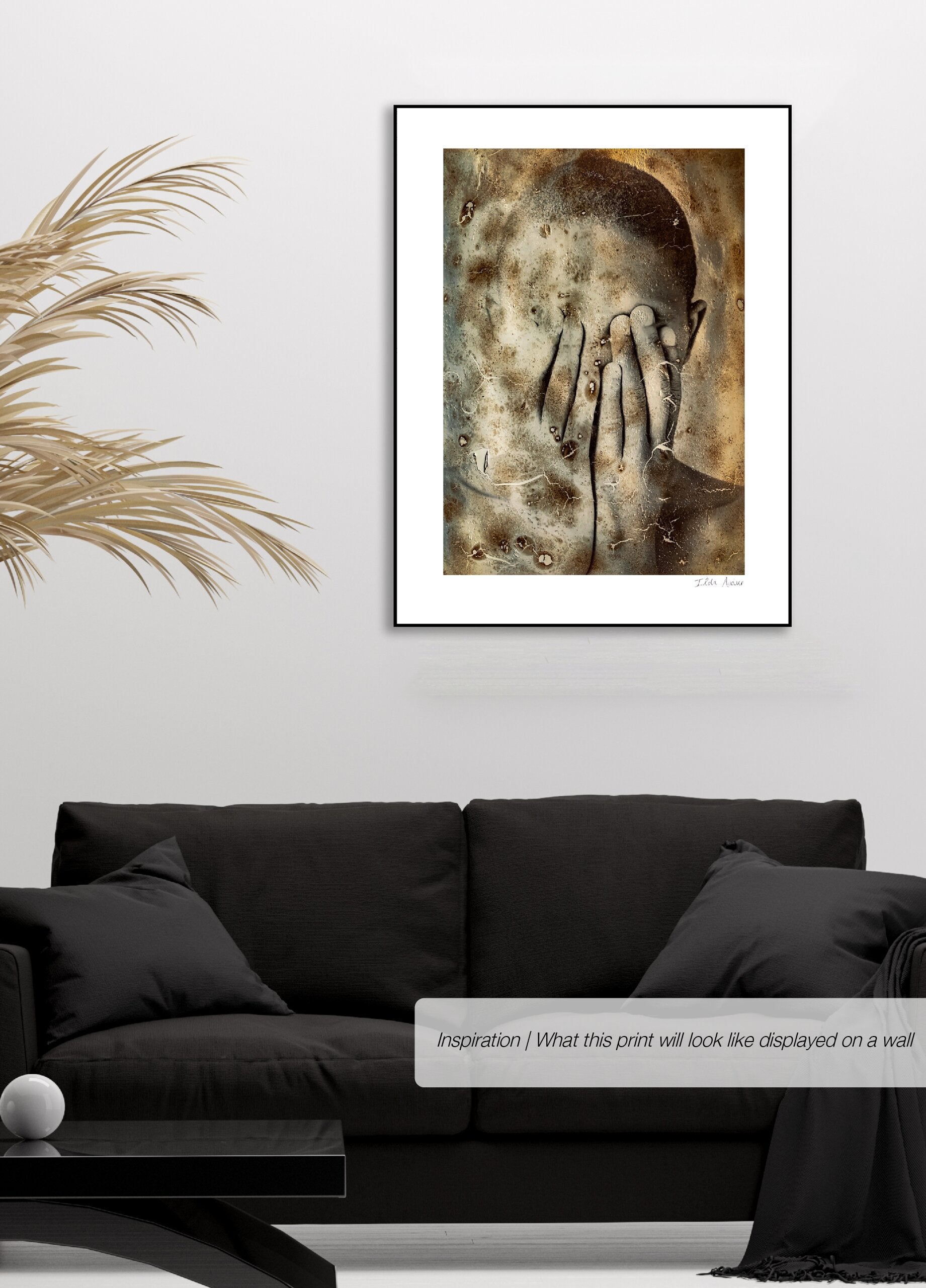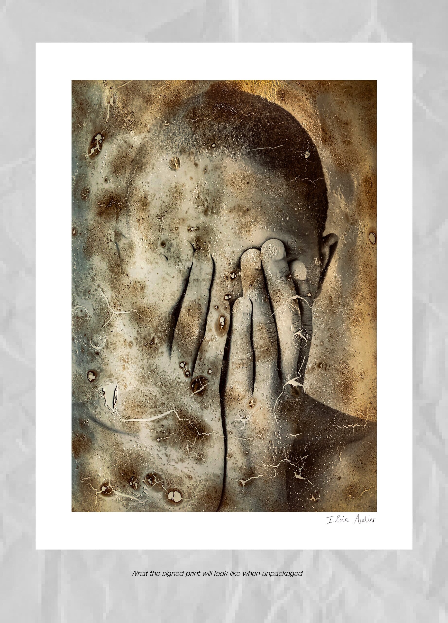 This burnt, peeling image of a man hiding behind his hands, questions whether there should be any importance placed on physical appearance or skin colour. After all real beauty is Skin Deep.
