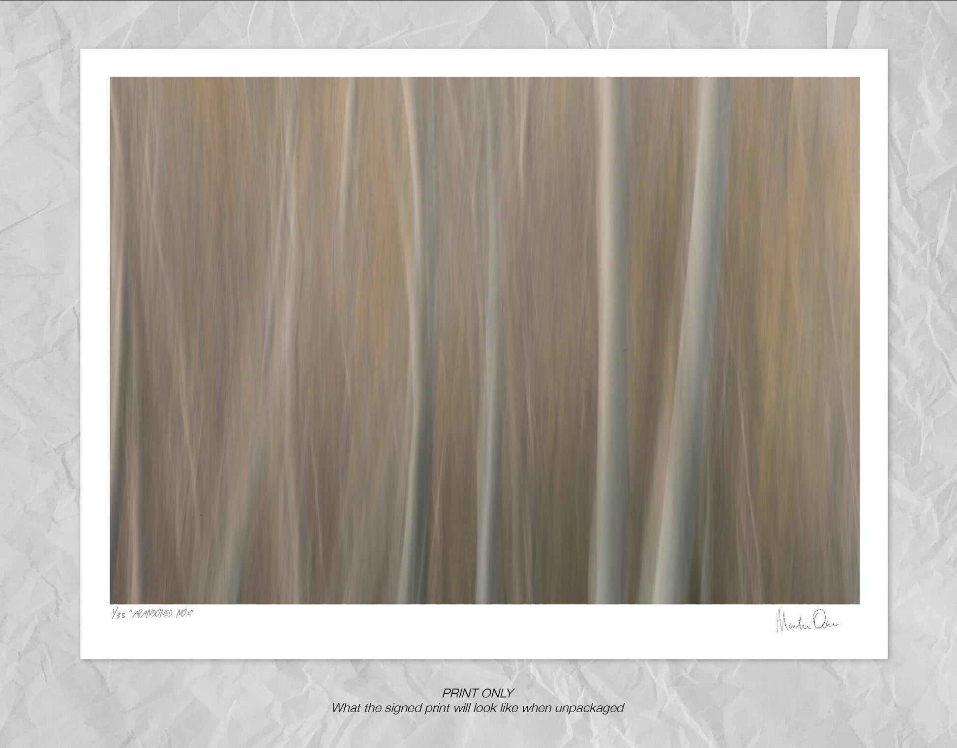 An abstract impression of a magical forest comprising of aesthetic accentuated lines and soft pastel colour. This print forms part of a complete portfolio of dreamlike landscapes.