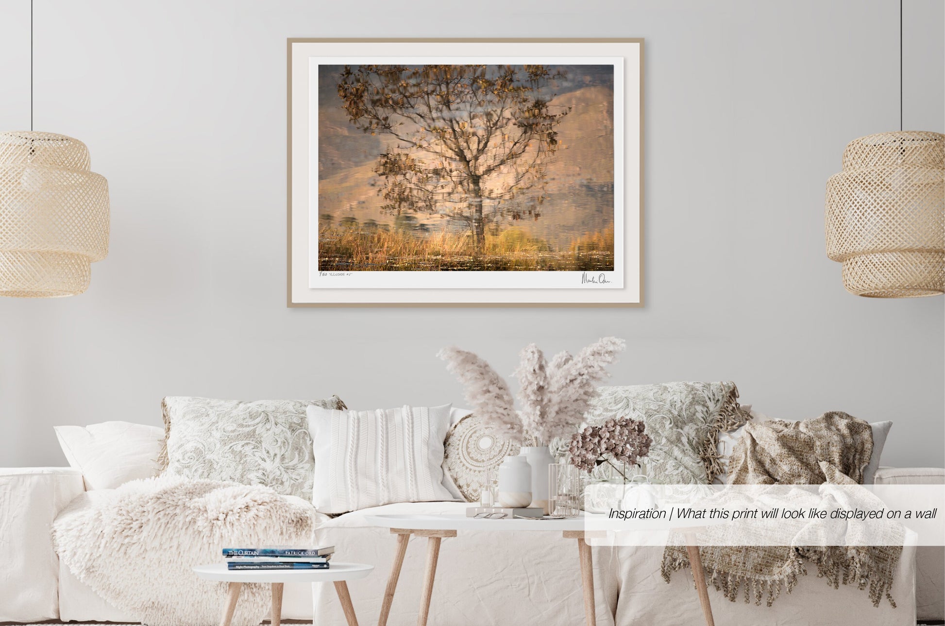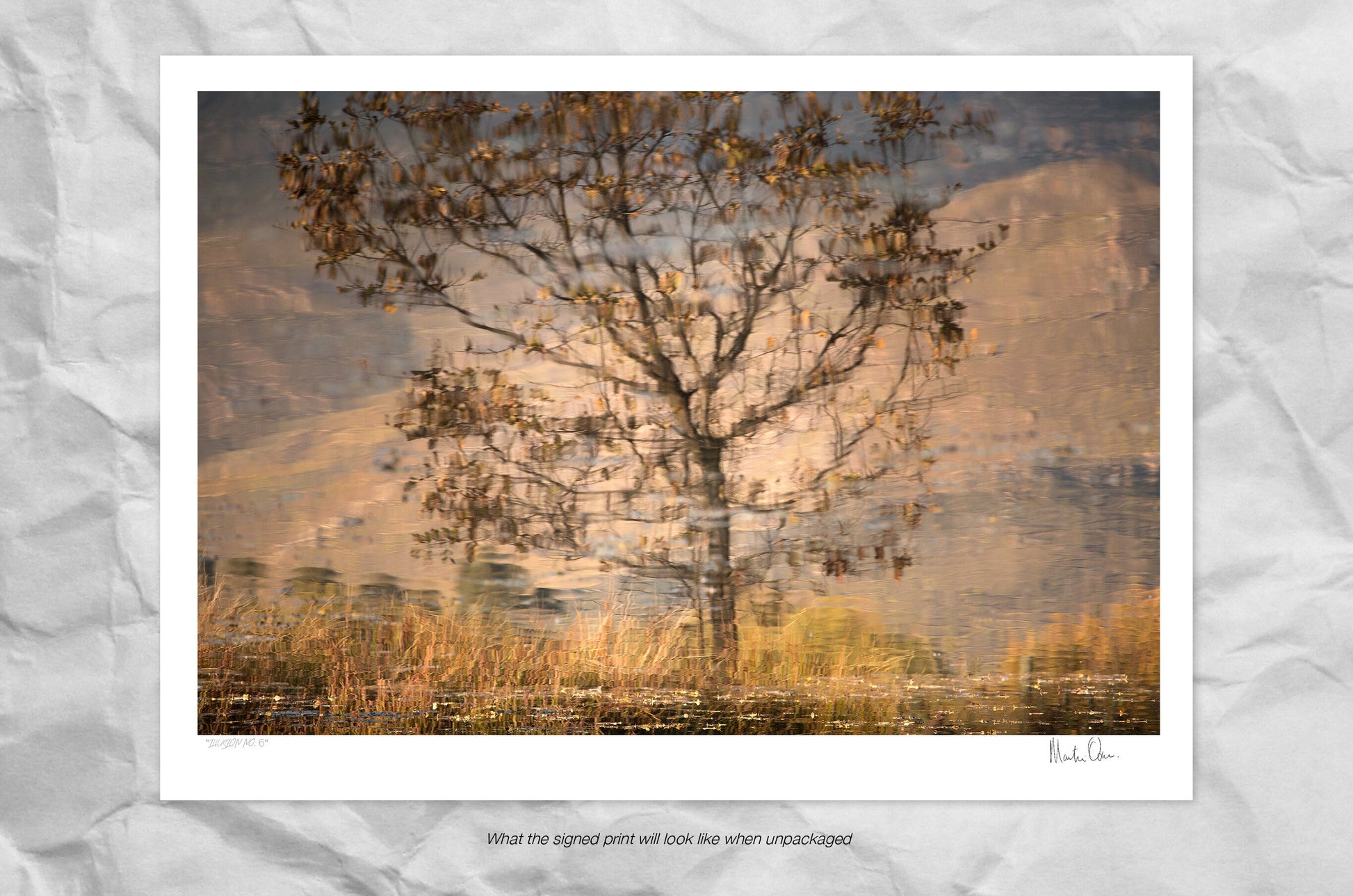 This photograph taken of a reflection of an autumn tree in the water surrounded by mountains makes for a beautiful abstract impression. This print forms part of a complete portfolio of dreamlike landscapes.