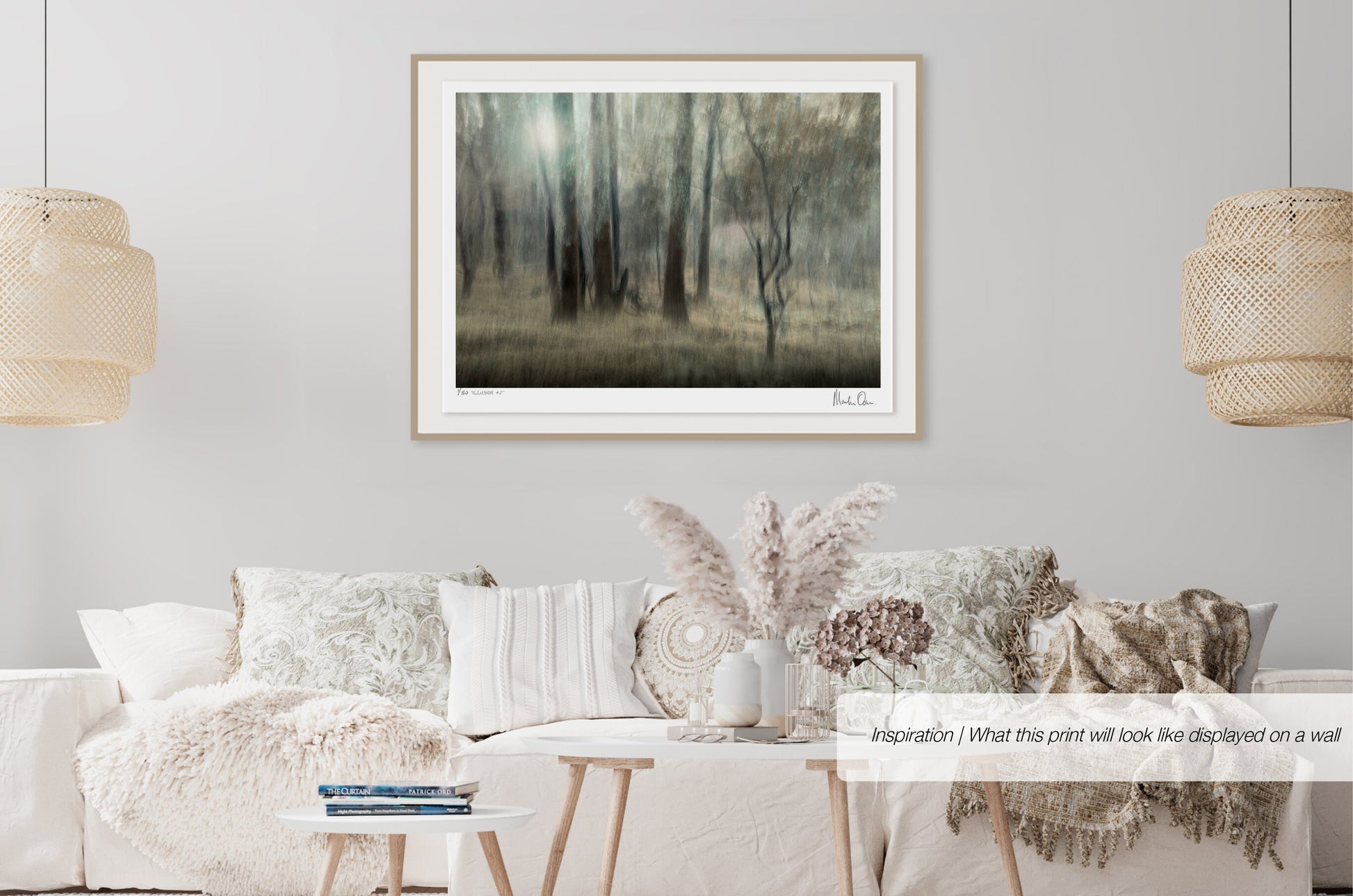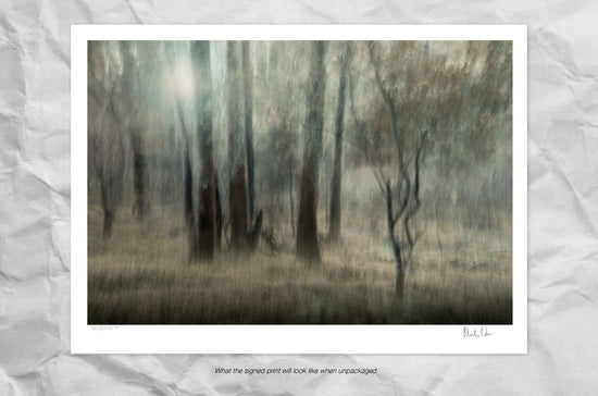 An abstract impression of a moody backlit forest. This print forms part of a complete portfolio of dreamlike landscapes.