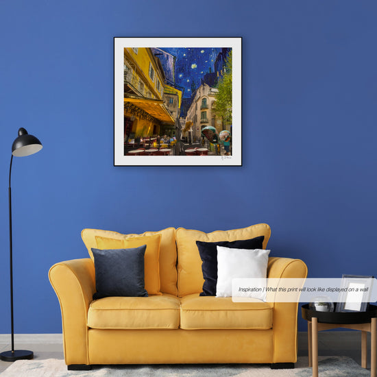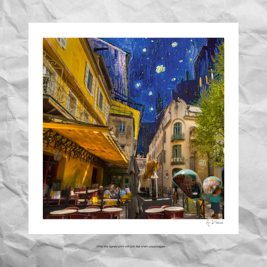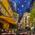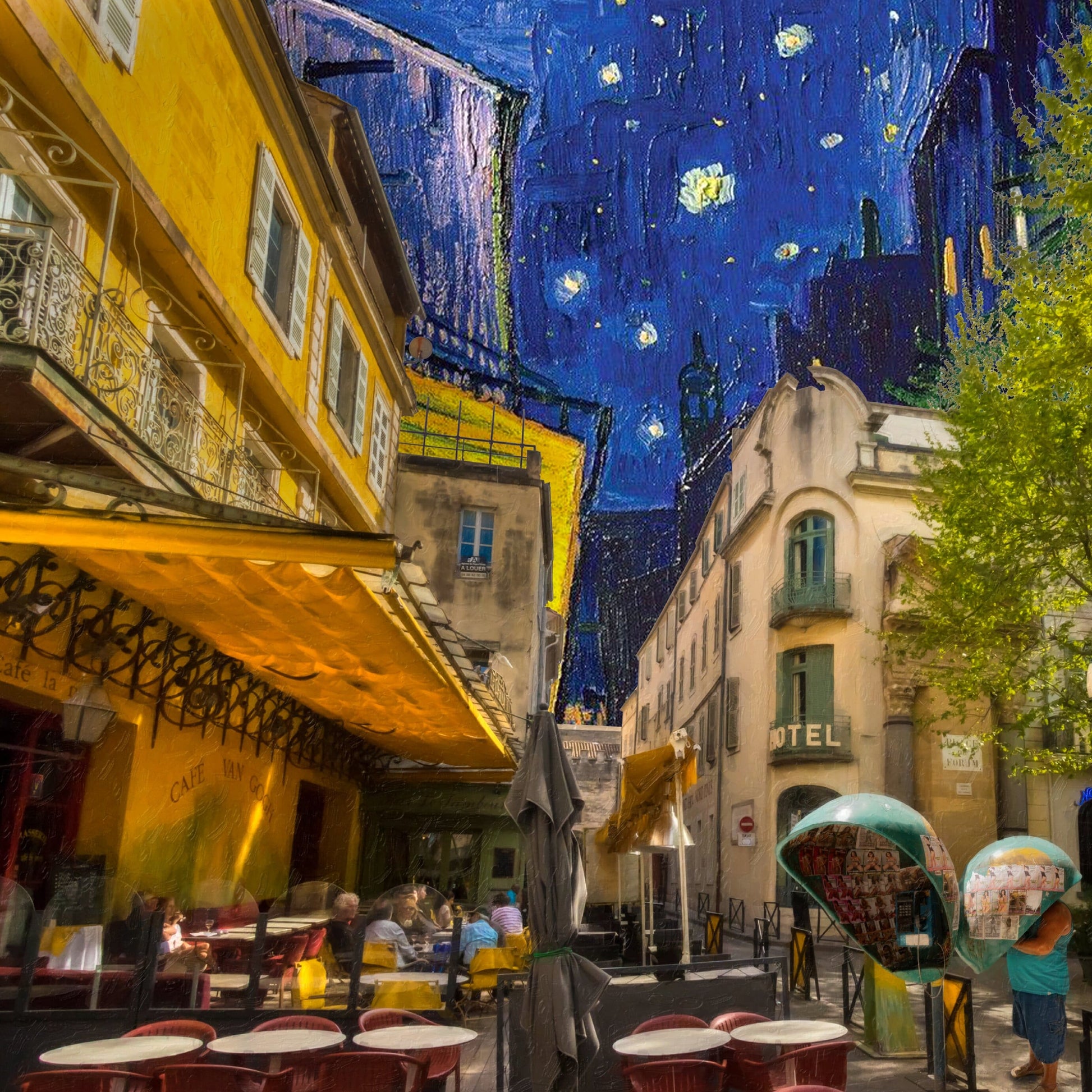 A digital photograph of the 'Van Gogh Cafè' in Arles, France. The artwork is completed with an overlay of Van Gogh's painted sky.