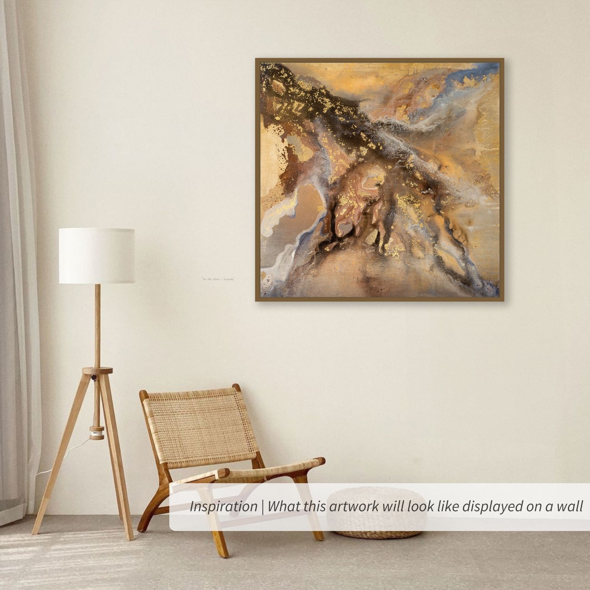 "Jovian" is a fluid abstract artwork inspired by the swirling atmospheres of distant planets. Gold, earth tones, and soft blues merge in molten, flowing layers, while metallic highlights evoke the energy of a celestial storm. The piece balances cosmic movement with raw, organic texture, inviting viewers into a world where planetary and earthly elements meet.