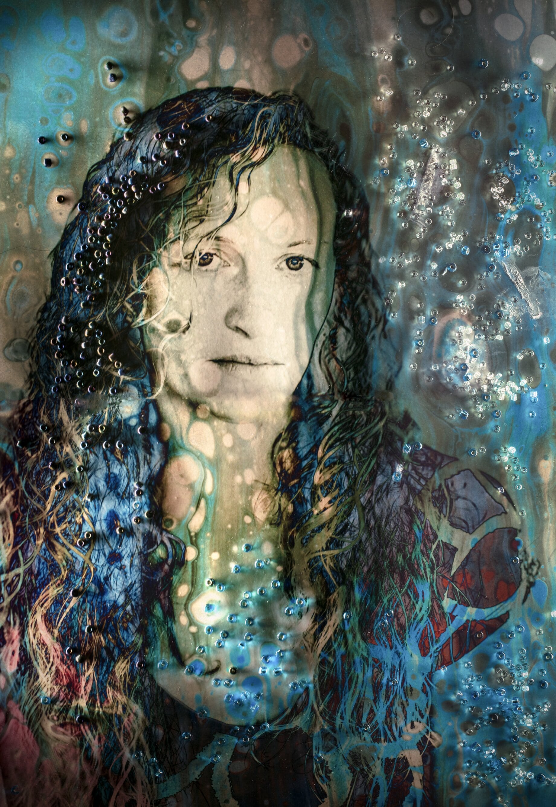 An acrylic abstract layered with a photograph and topped with scattered beads. This artwork celebrates Lisa, the artists' sister, and all the layers of her gorgeous personality.