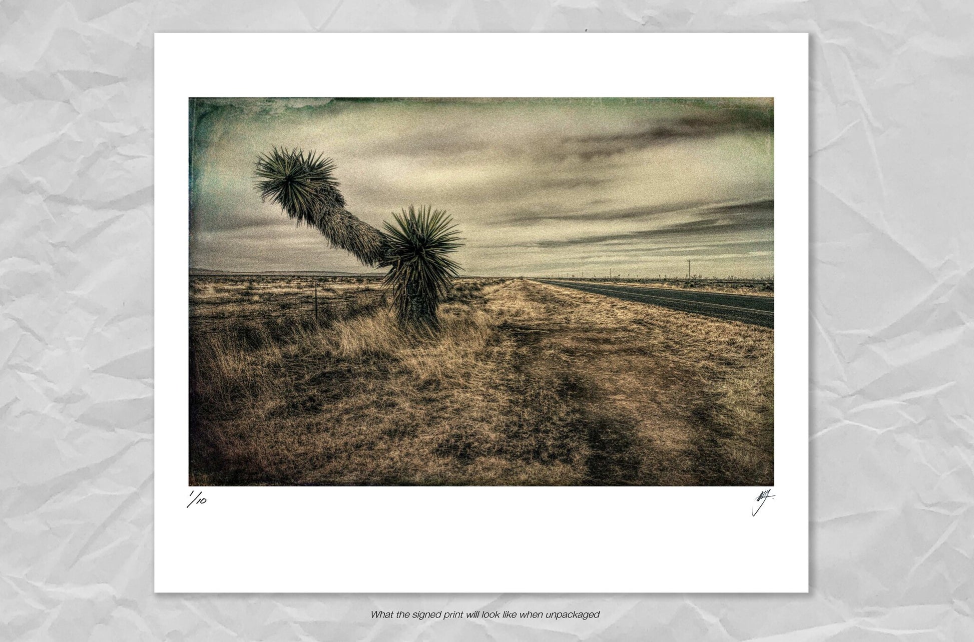 A moody landscape photograph of palm trees growing alongside Route 90 in the USA by award-winning and world-renowned photographer, Harry De Zitter.