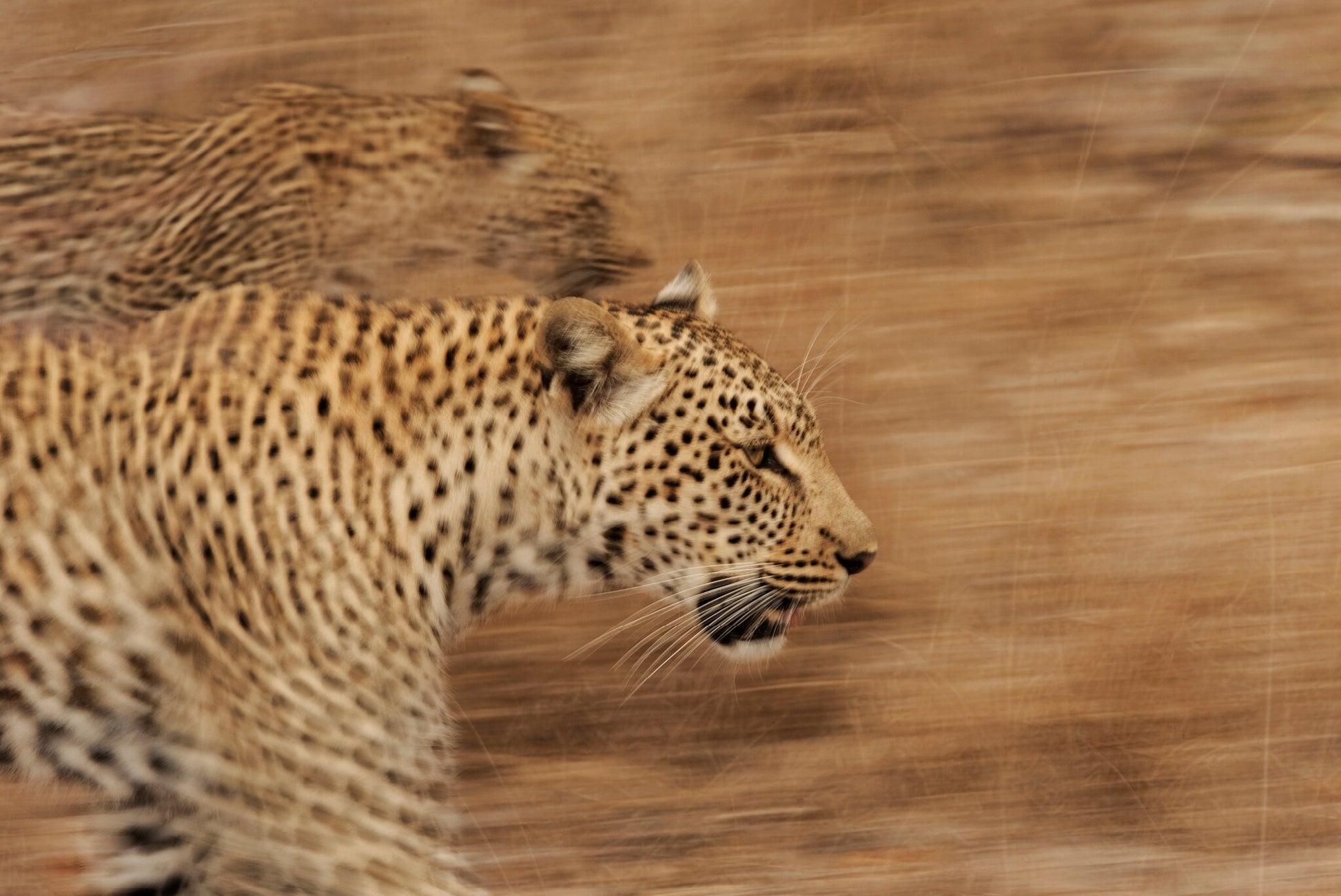 An incredible single edition master (collector) print photograph by award-winning wildlife photographer Greg du Toit capturing two leopards on the prowl as they move through the long African grass.