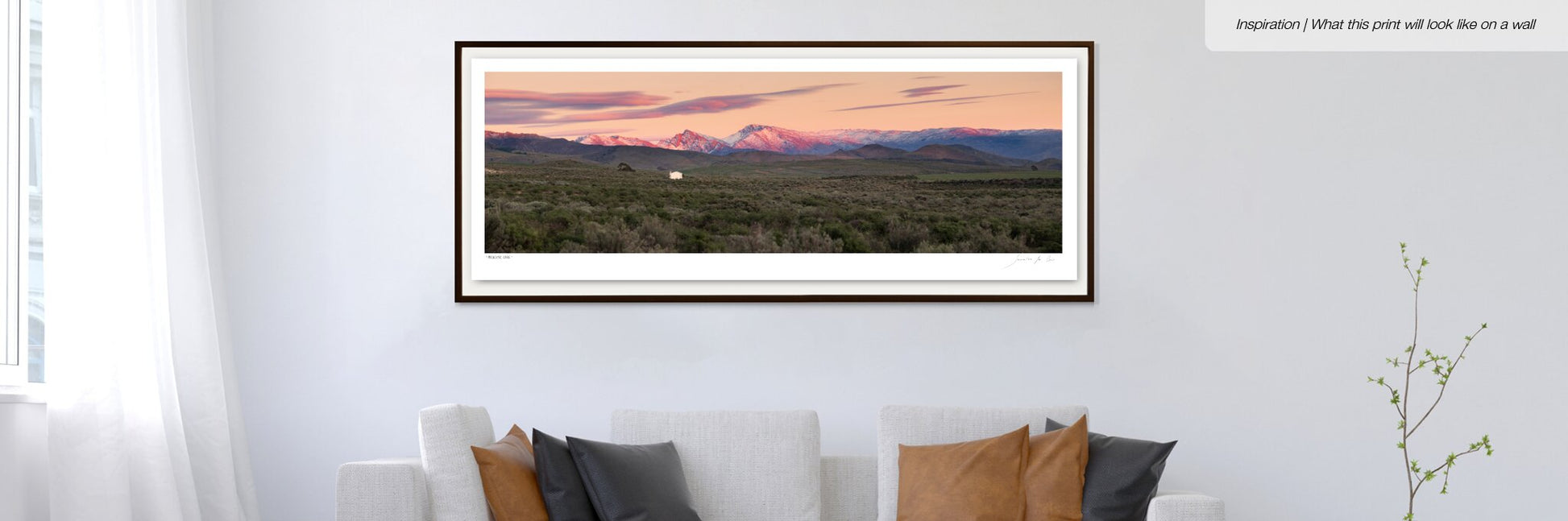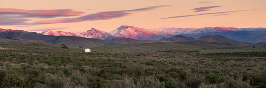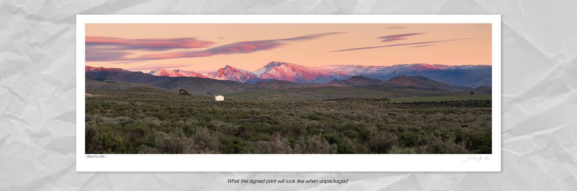A breathtaking print of a shepherds hut in the Koo Valley, photographed as the early morning light illuminates the snow-capped mountain range in the distance.