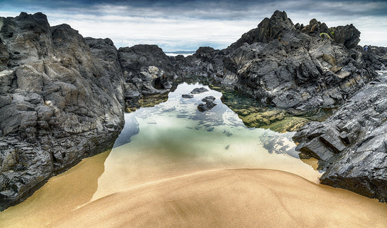 Turquoise reflections of a tidal pool surrounded by rocks.