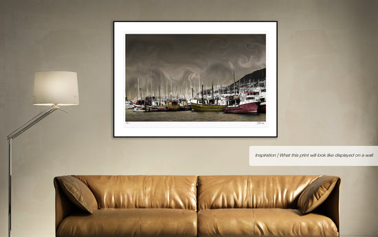 The yachts moored in Hout Bay harbour are portrayed in a beautiful abstract impression that has been created using various digital art techniques.