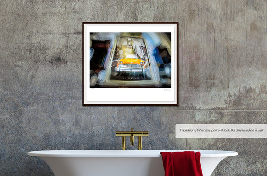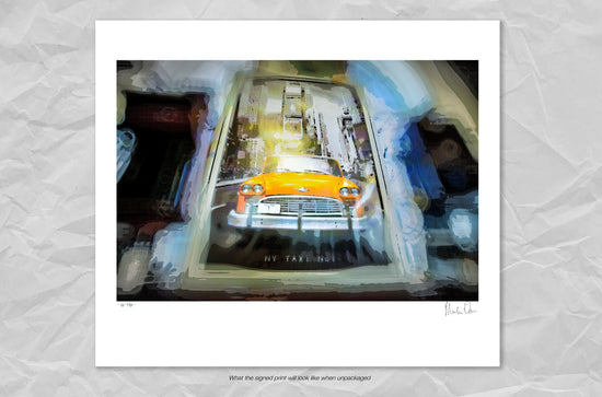 A quirky pop-art style photograph featuring an iconic yellow New York taxi cab.